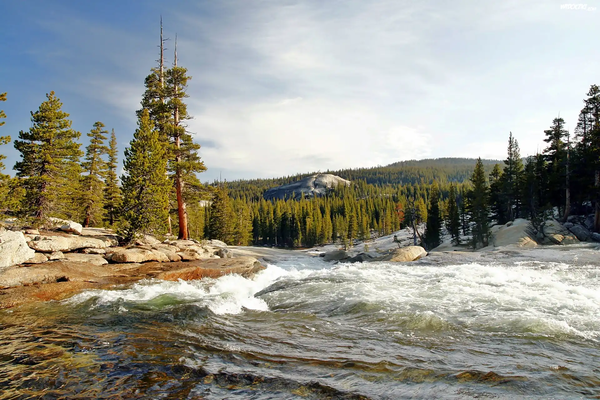 Lasy, Wzgórza, Rwąca, Rzeka, Głazy, Przebijające, Światło