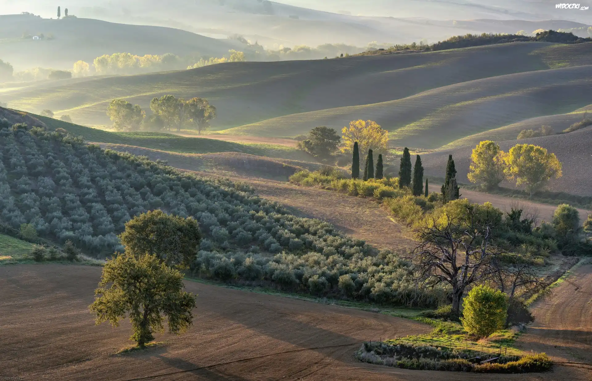 Zdjęcia, Pola, Drzewa, Wzgórza, Poranek, Mgła, Dolina Val d Orcia, Toskania, Włochy