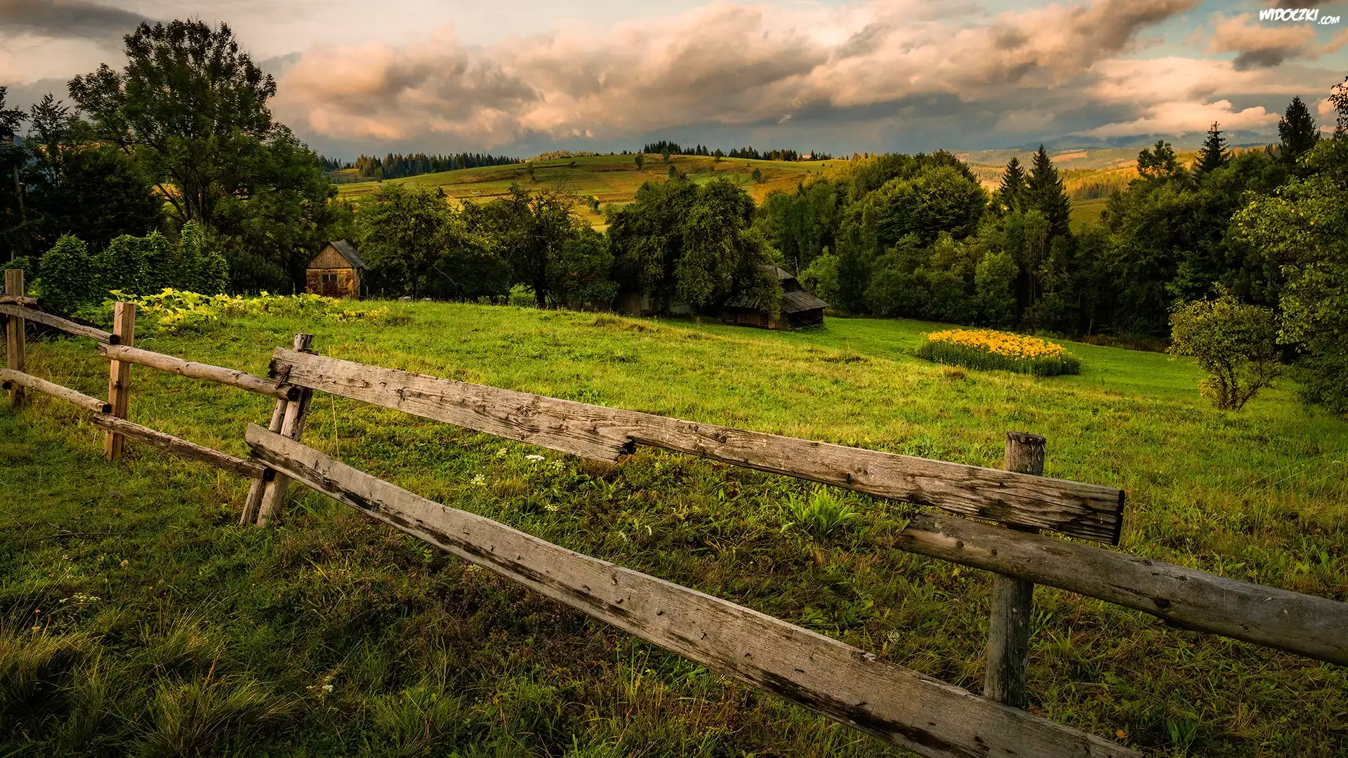 Wzgórza, Łąka, Drzewa, Chmury, Ogrodzenie, Domy