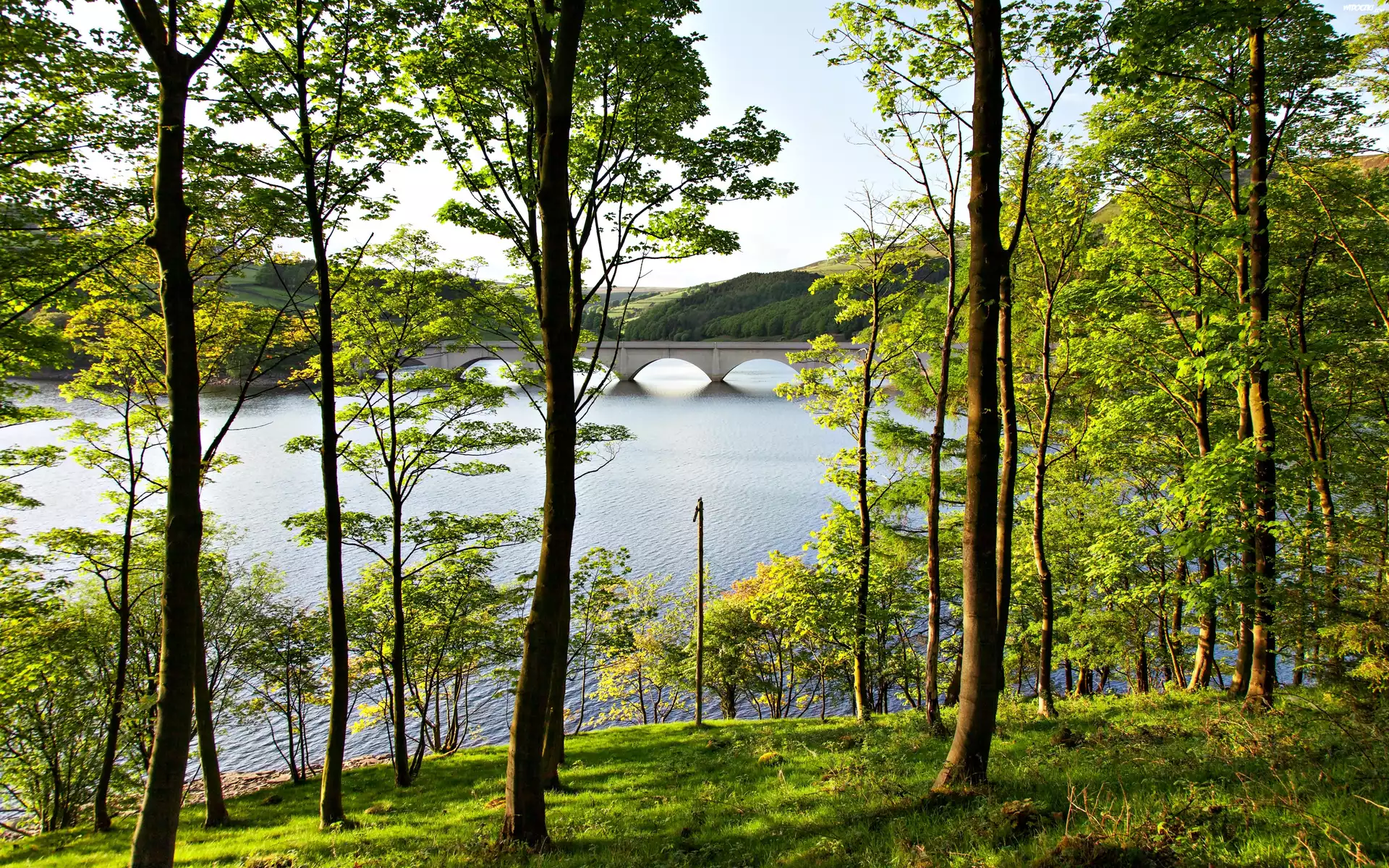 Zdjęcia, Wzgórza, Rzeka, Most, Drzewa, Przebijające, Światło