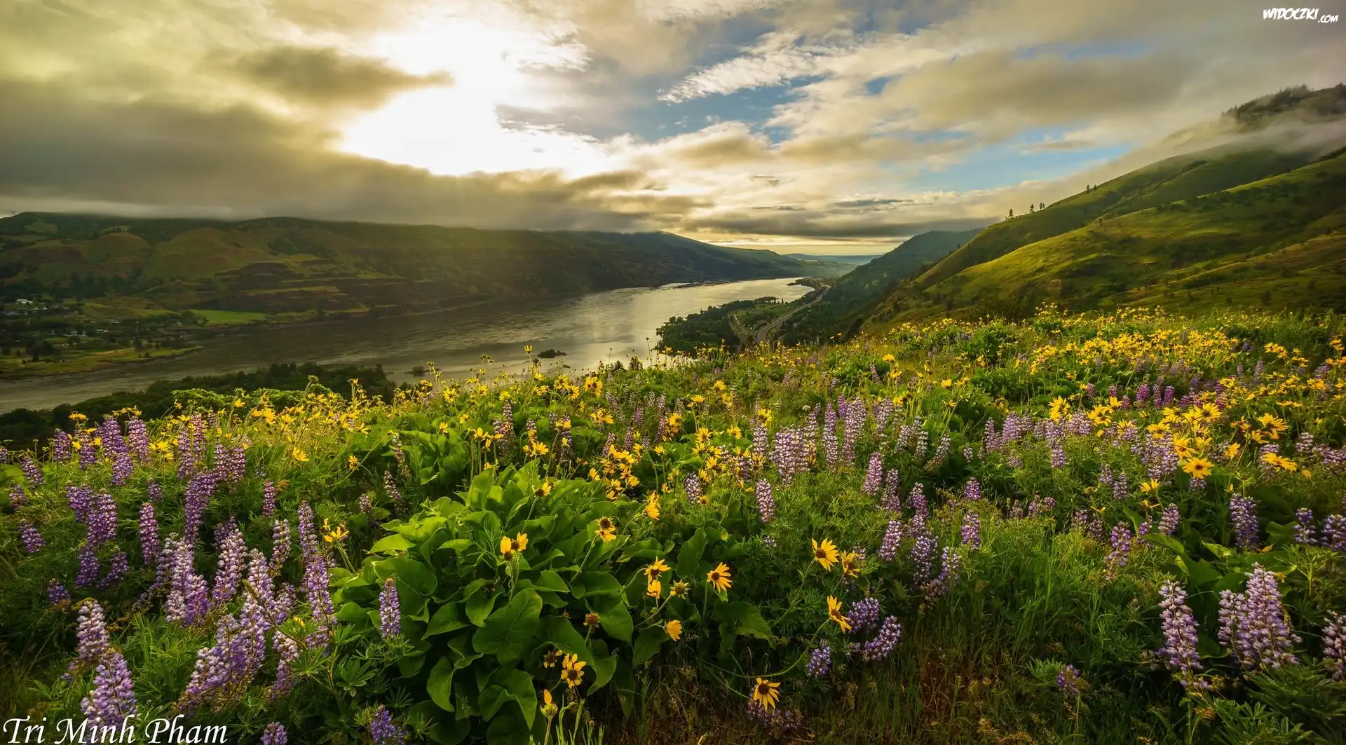 Zdjęcia, Wzgórza, Kwiaty, Łąka, Rzeka, Mgła