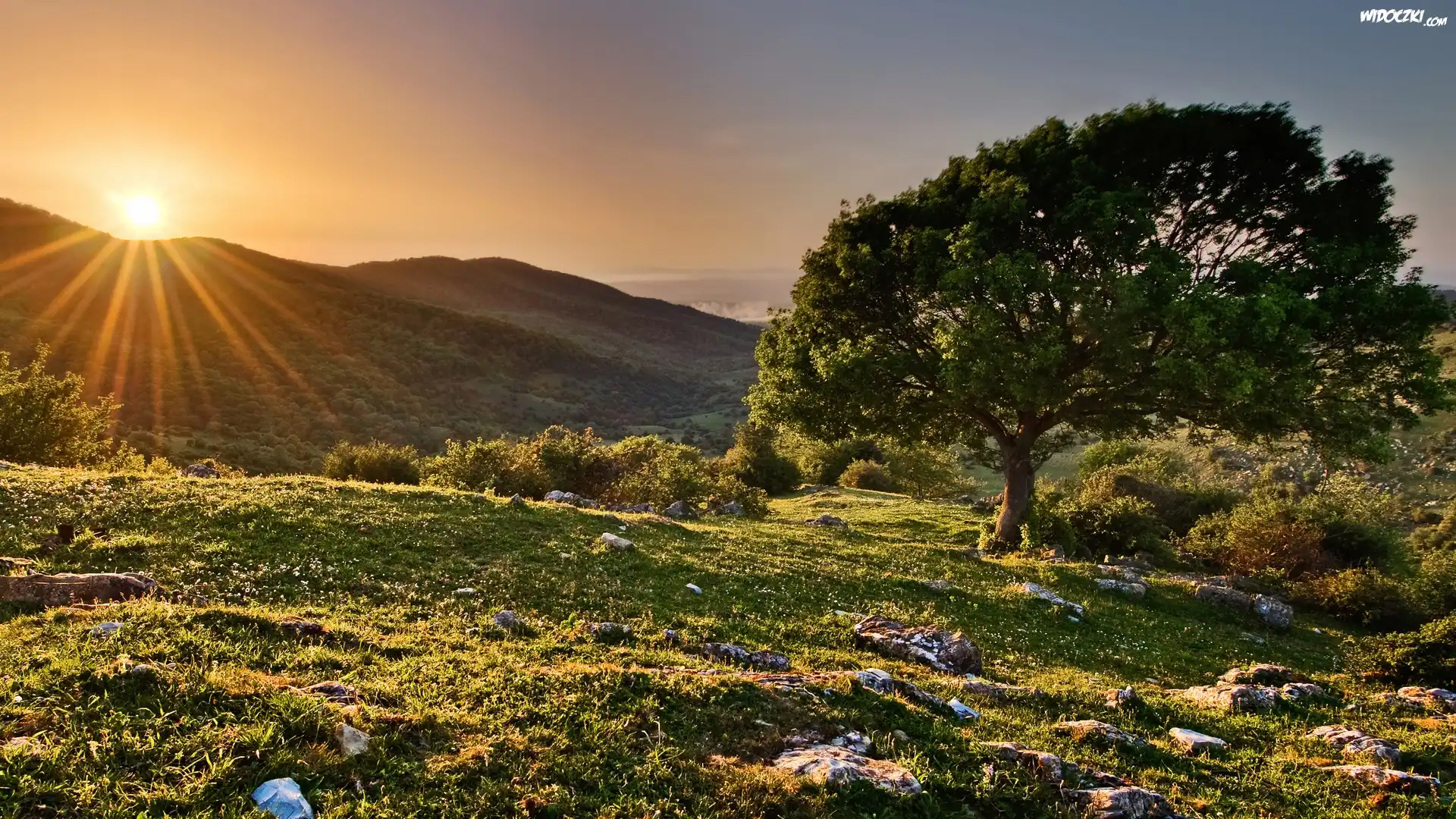 Zdjęcia, Wzgórza, Drzewa, Wschód Słońca, Promienie