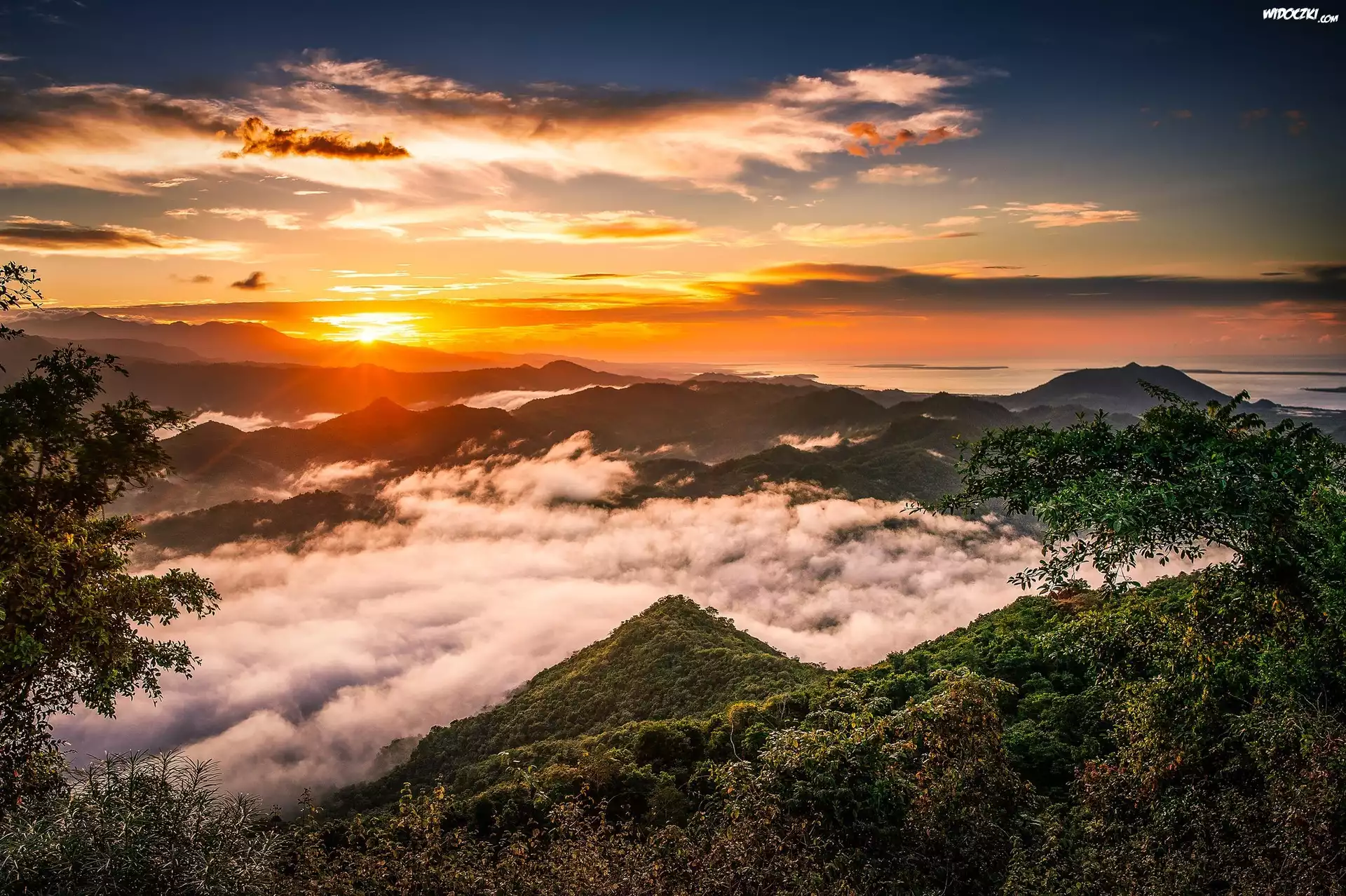 Wzgórza, Mgła, Zachód słońca, Drzewa