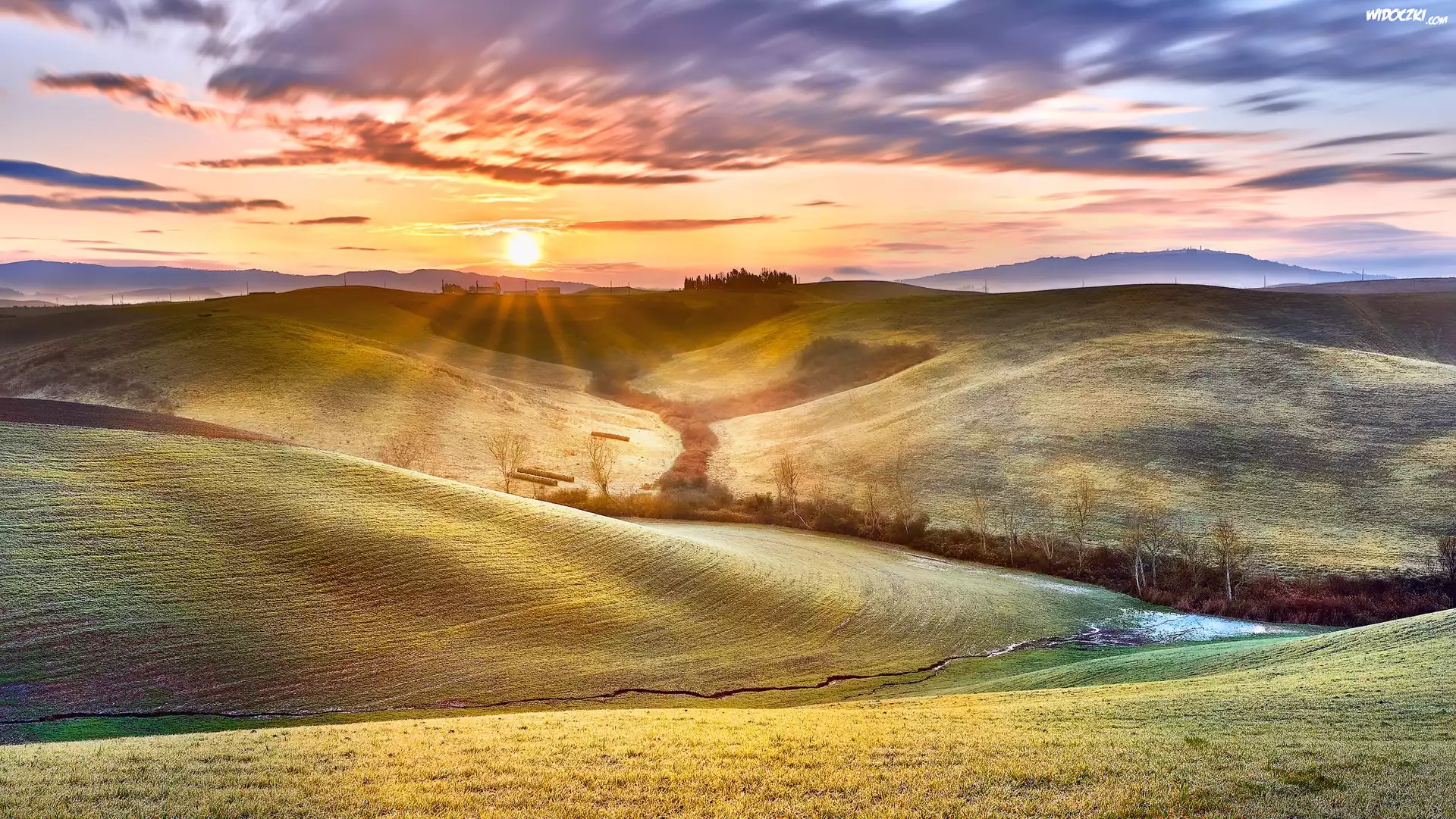 Wschód słońca, Wzgórza, Pola, Trawa, Drzewa, Villamagna, Prowincja Chieti, Abruzja, Włochy