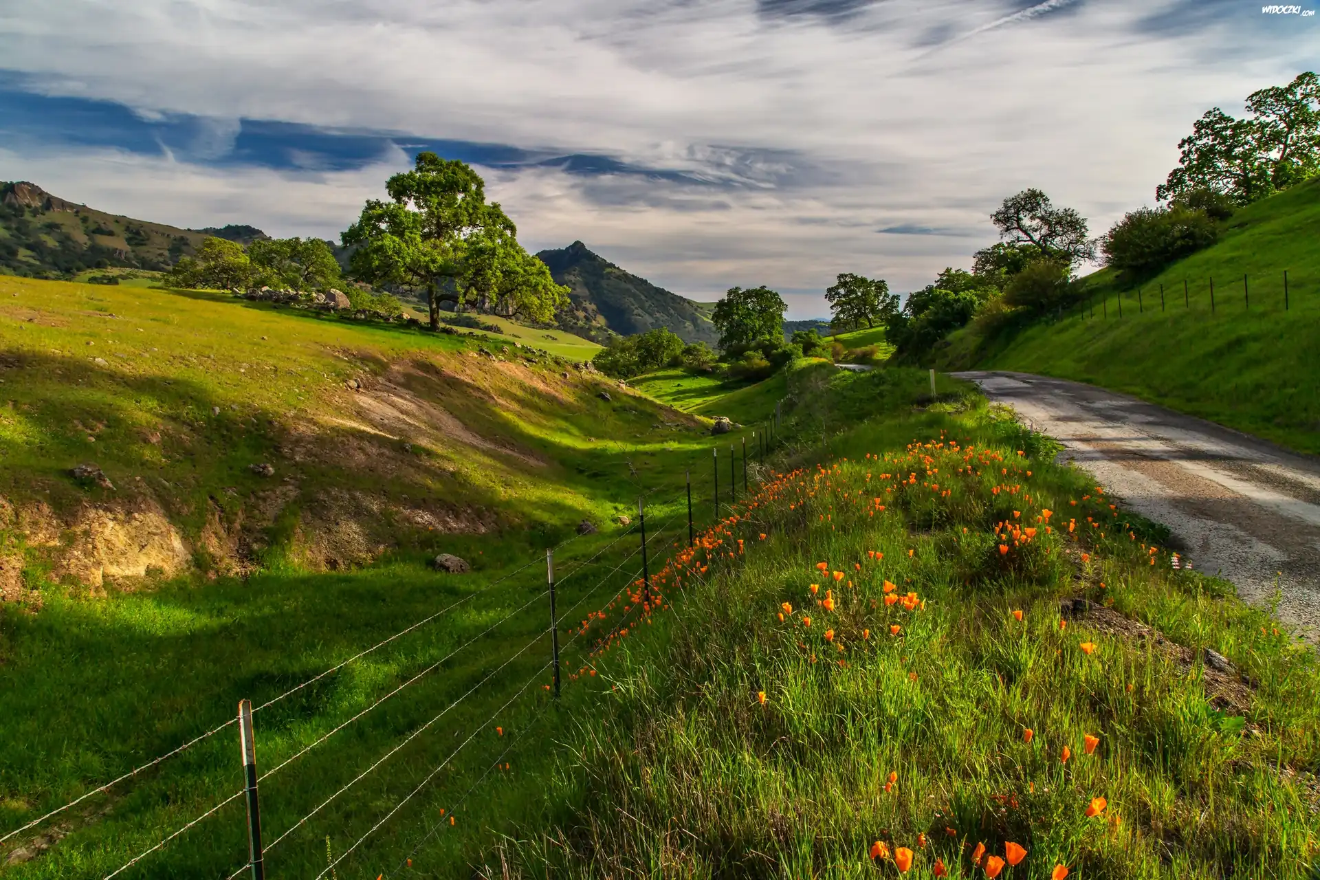 Wzgórza, Droga, Łąka, Maki, Światło, Cień