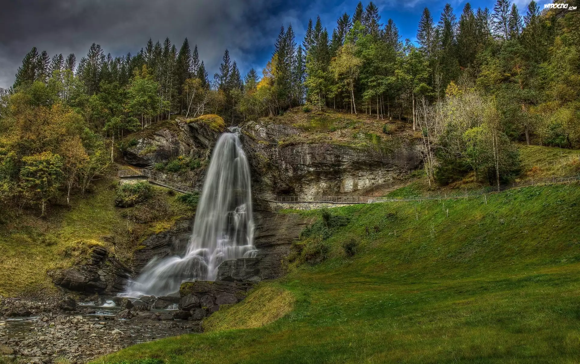 Wzgórza, Drzewa, Wodospad, Kamienie