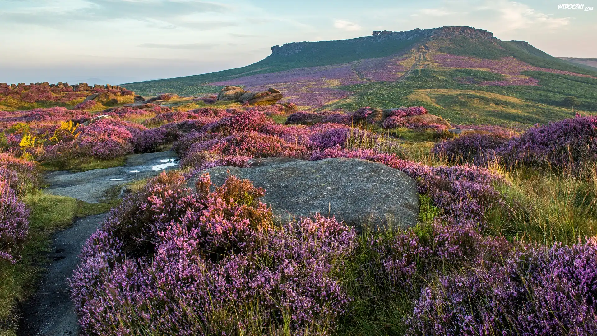 Anglia, Park Narodowy Peak District, Wzgórza, Skały, Wrzosy, Wrzosowisko