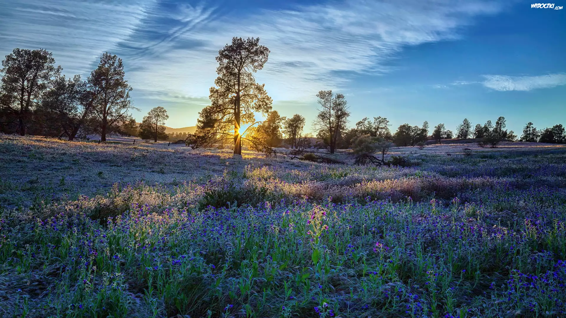 Zdjęcia, Wzgórza, Łąka, Kwiaty, Drzewa, Wschód Słońca