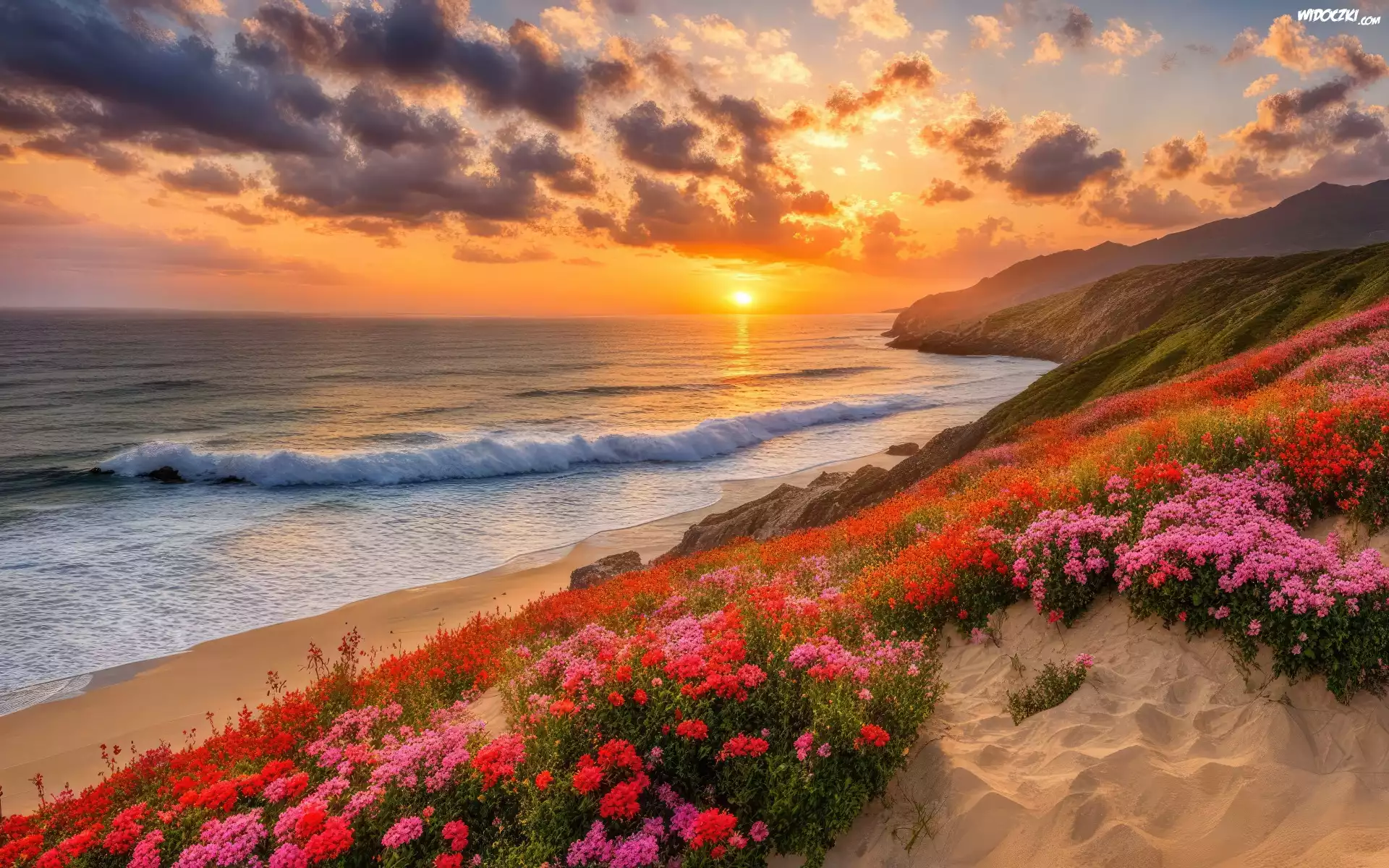Zdjęcia, Morze, Zachód słońca, Wzgórza, Kwiaty, Wybrzeże