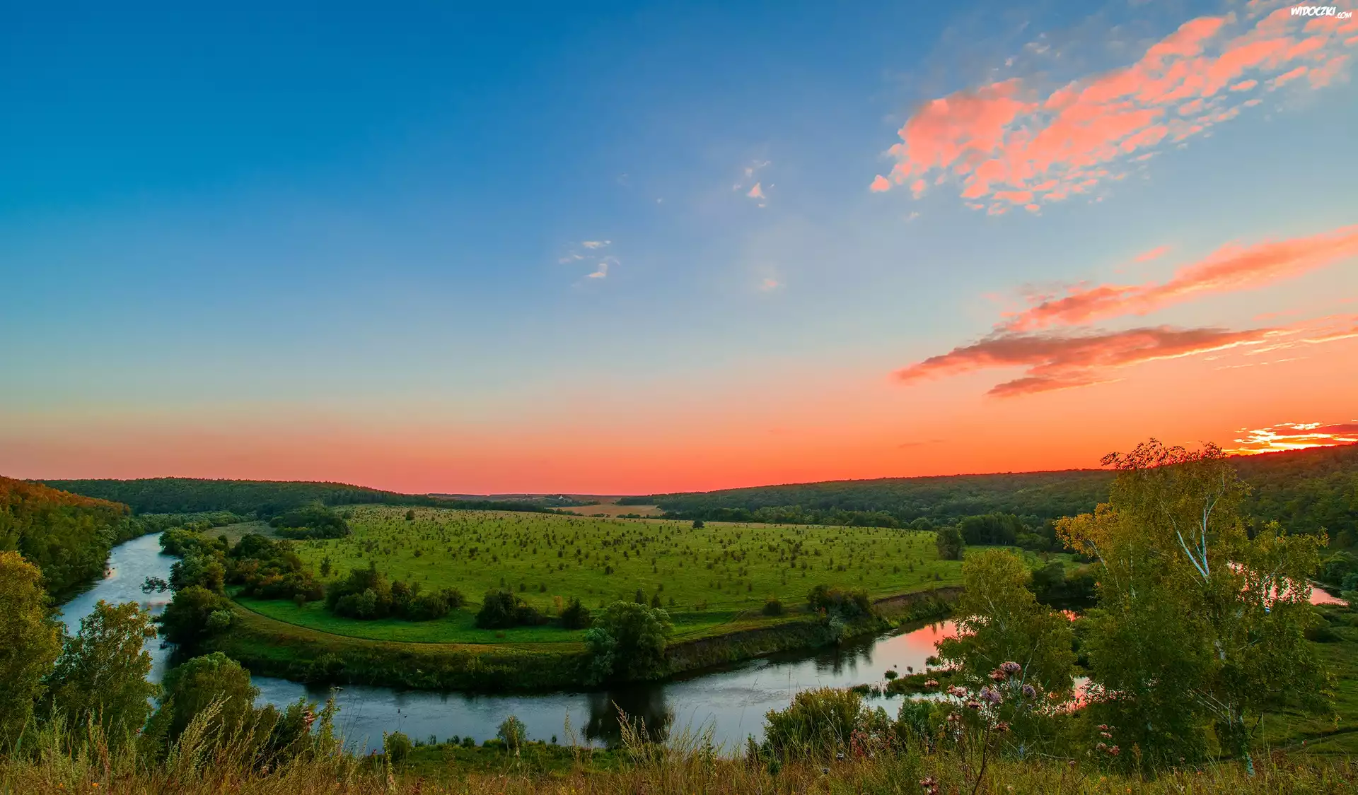 Zdjęcia, Wzgórza, Rzeka, Drzewa, Zachód, Słońca