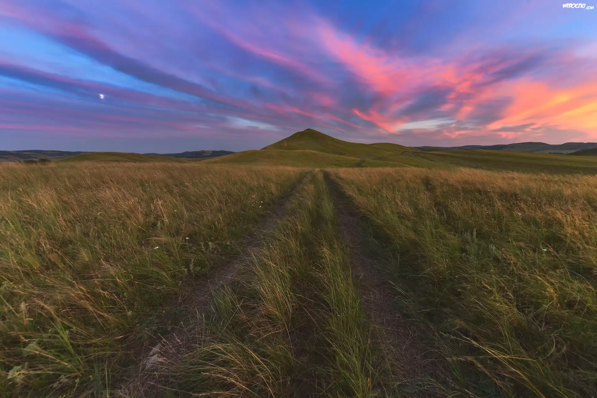 Wzgórza, Łąka, Trawa, Chmury, Zachód słońca