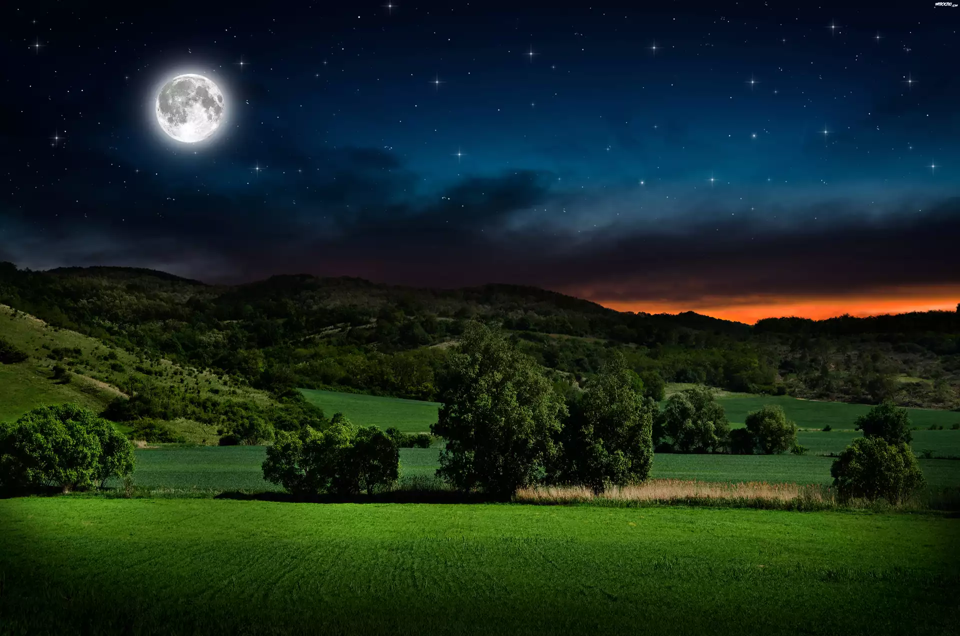 Zielone, Wzgórza, Łąka, Drzewa, Ciemne, Niebo, Księżyc