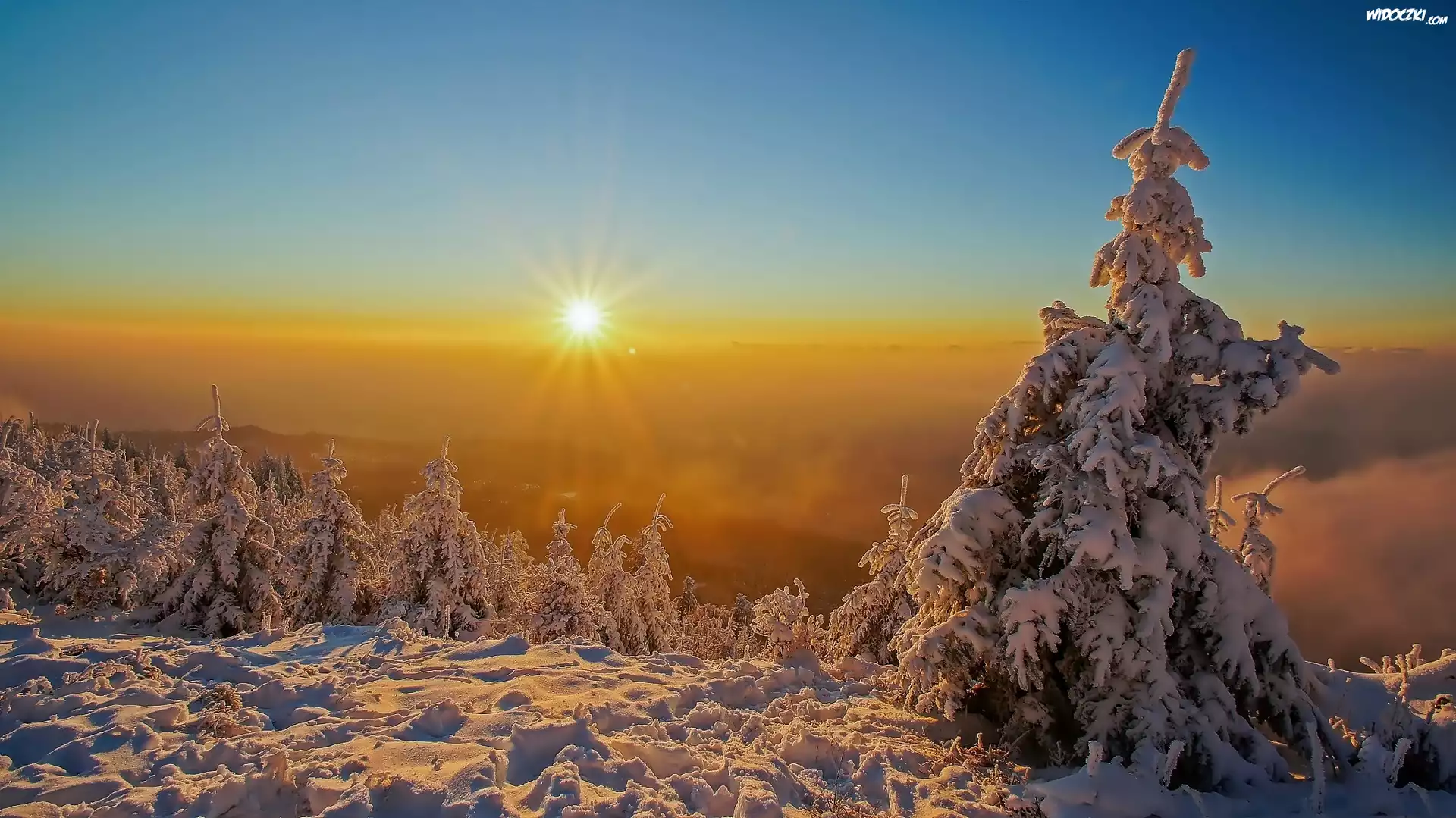 Zima, Wzgórza, Ośnieżone, Drzewa, Śnieg, Wschód słońca