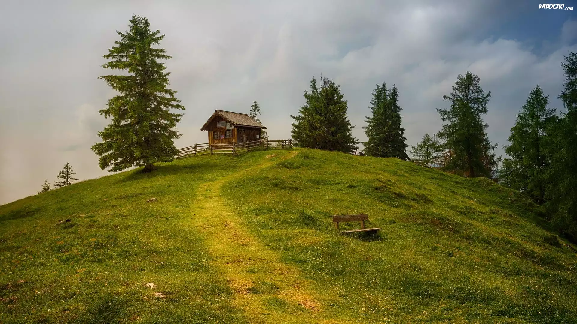 Zdjęcia, Wzgórze, Drewniany, Domek, Drzewa, Ścieżka, Ławeczka