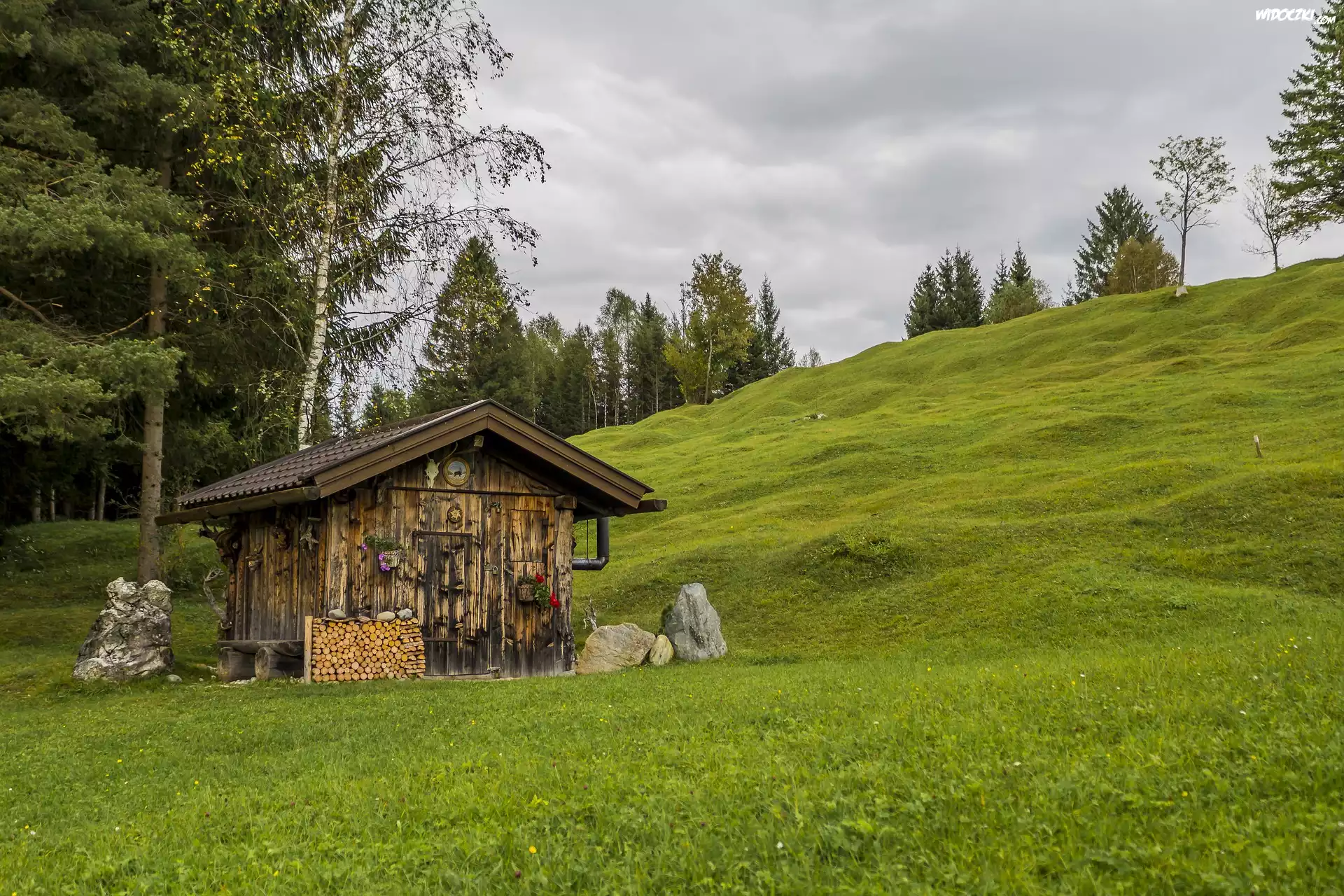 Zdjęcia, Łąka, Wzgórze, Drzewa, Domek, Chmury