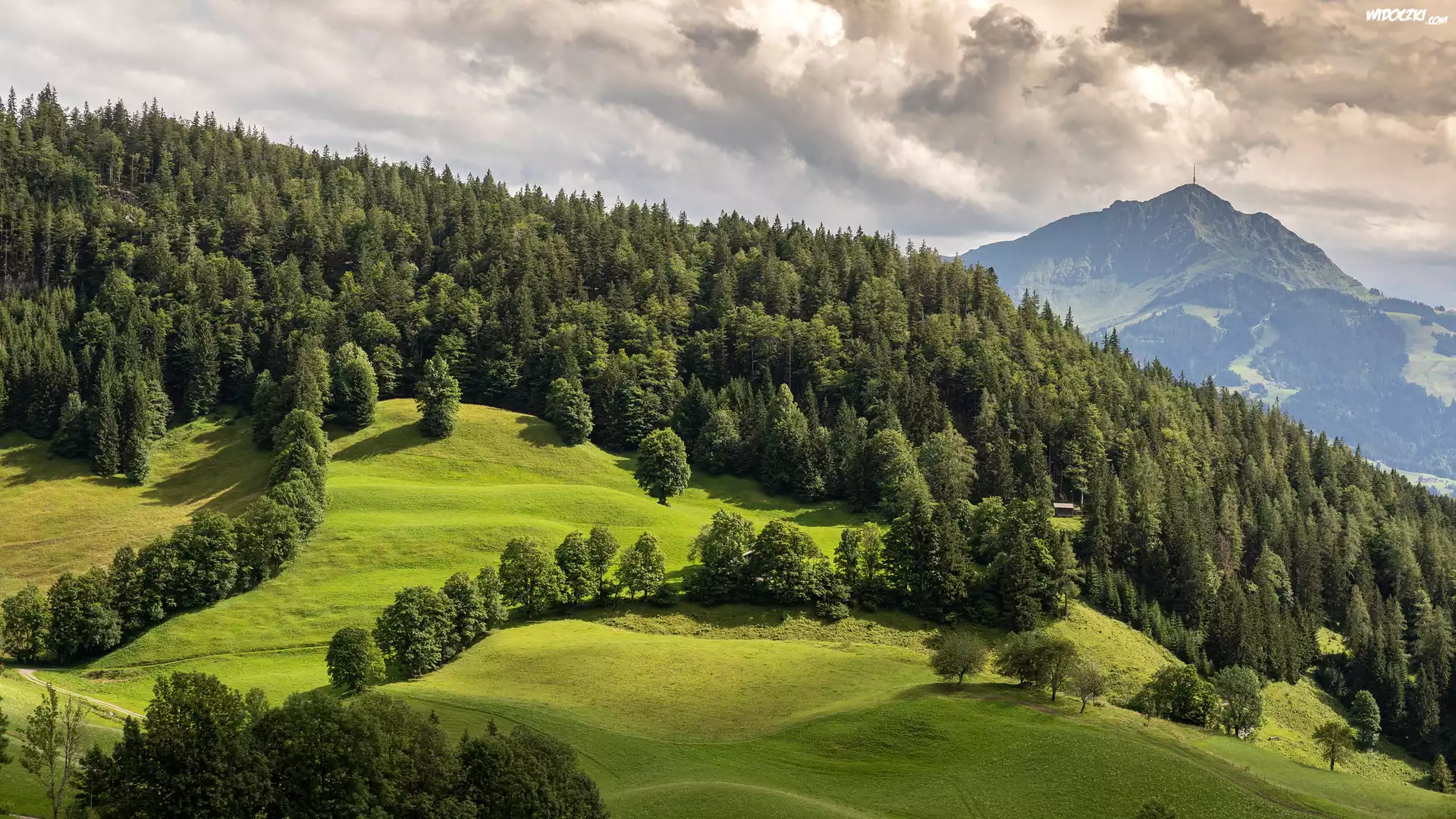 Łąki, Wzgórze, Drzewa, Lasy, Góry