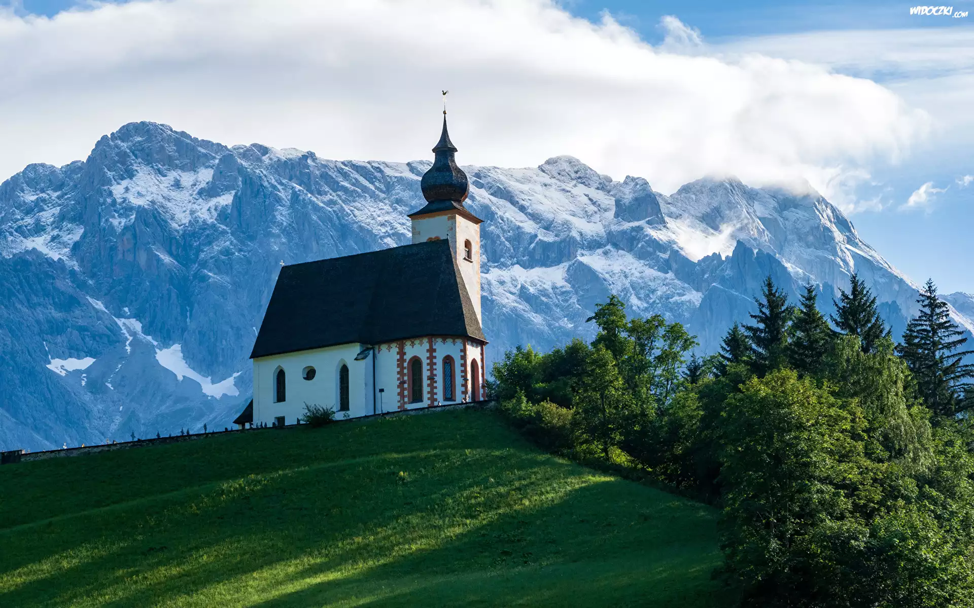 Ośnieżone, Góry, Drzewa, Wzgórze, Kościół, Trawa, Niebo