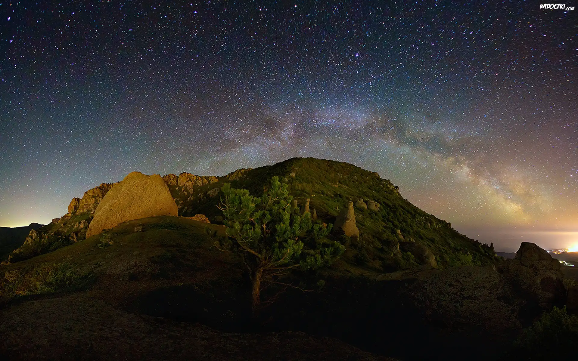 Zdjęcia, Wzgórze, Drzewo, Niebo, Gwiazdy