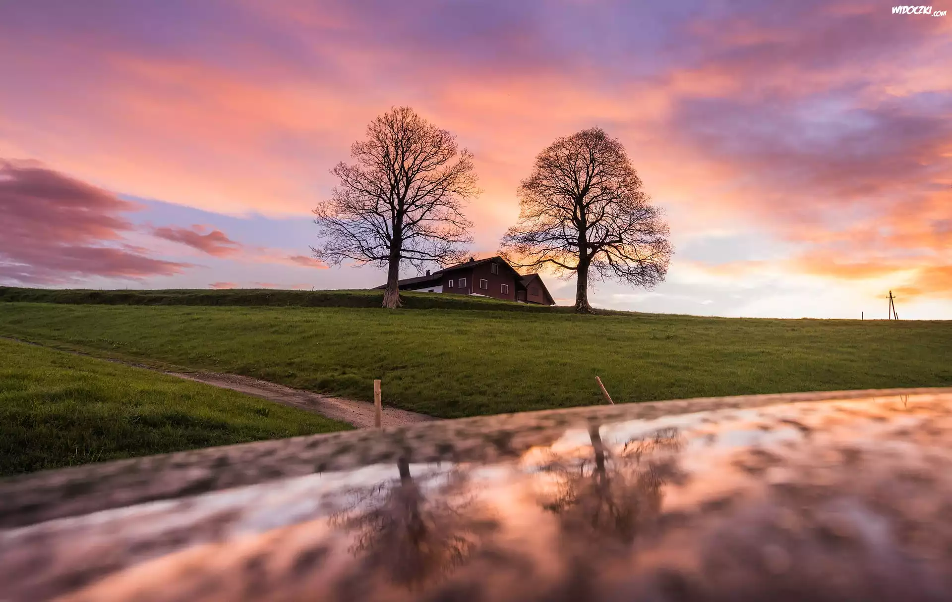 Zdjęcia, Pole, Dom, Rzeka, Wzgórze, Drzewa, Niebo, Odbicie