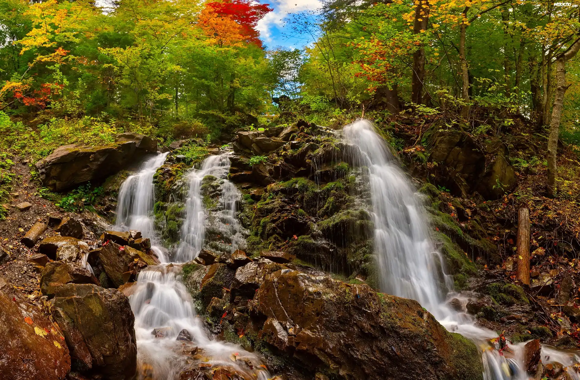Zdjęcia, Wodospad, Wzgórze, Las, Drzewa, Kamienie, Skały, Jesień