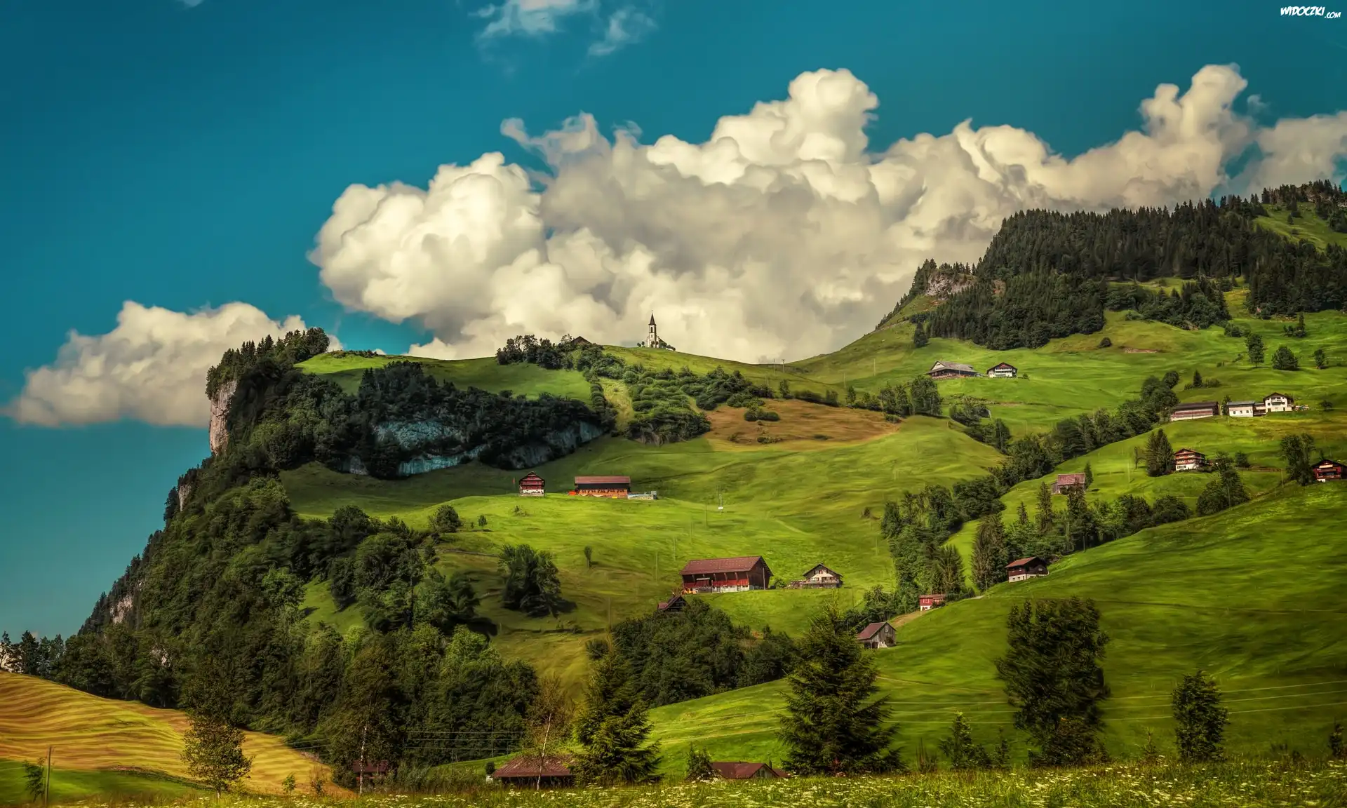 Wzgórze, Domy, Niebo, Zieleń, Drzewa
