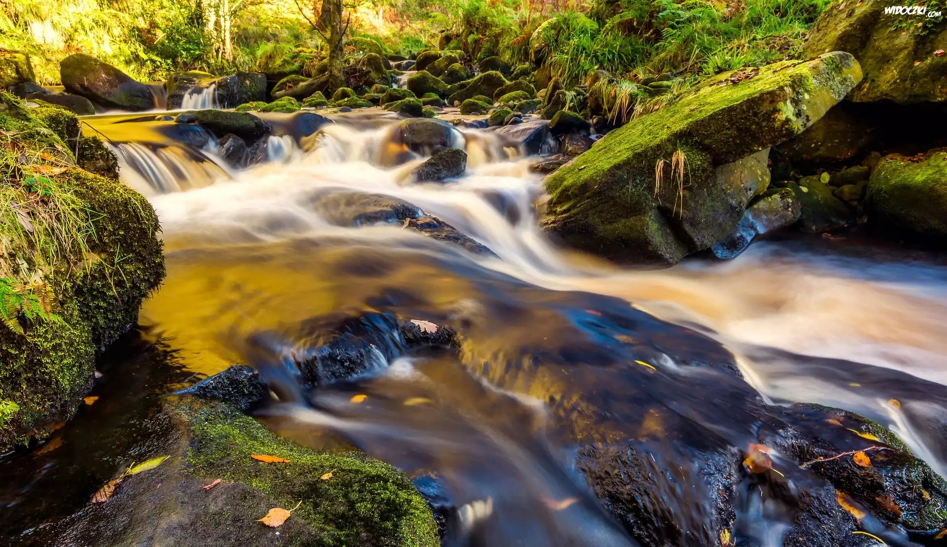 Zdjęcia, Anglia, Hrabstwo Yorkshire, Las Valley Of Desolation, Rzeka, Omszałe, Kamienie, Rośliny