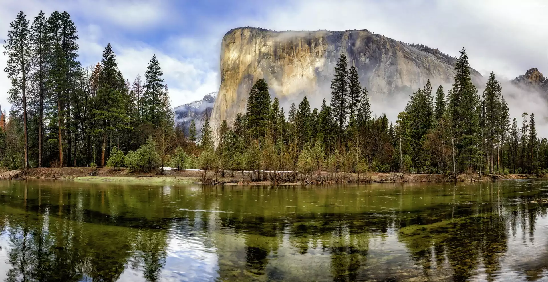 Zdjęcia, Stany Zjednoczone, Stan Kalifornia, Dolina Yosemite, Góry, Szczyt El Capitan, Rzeka, Drzewa
