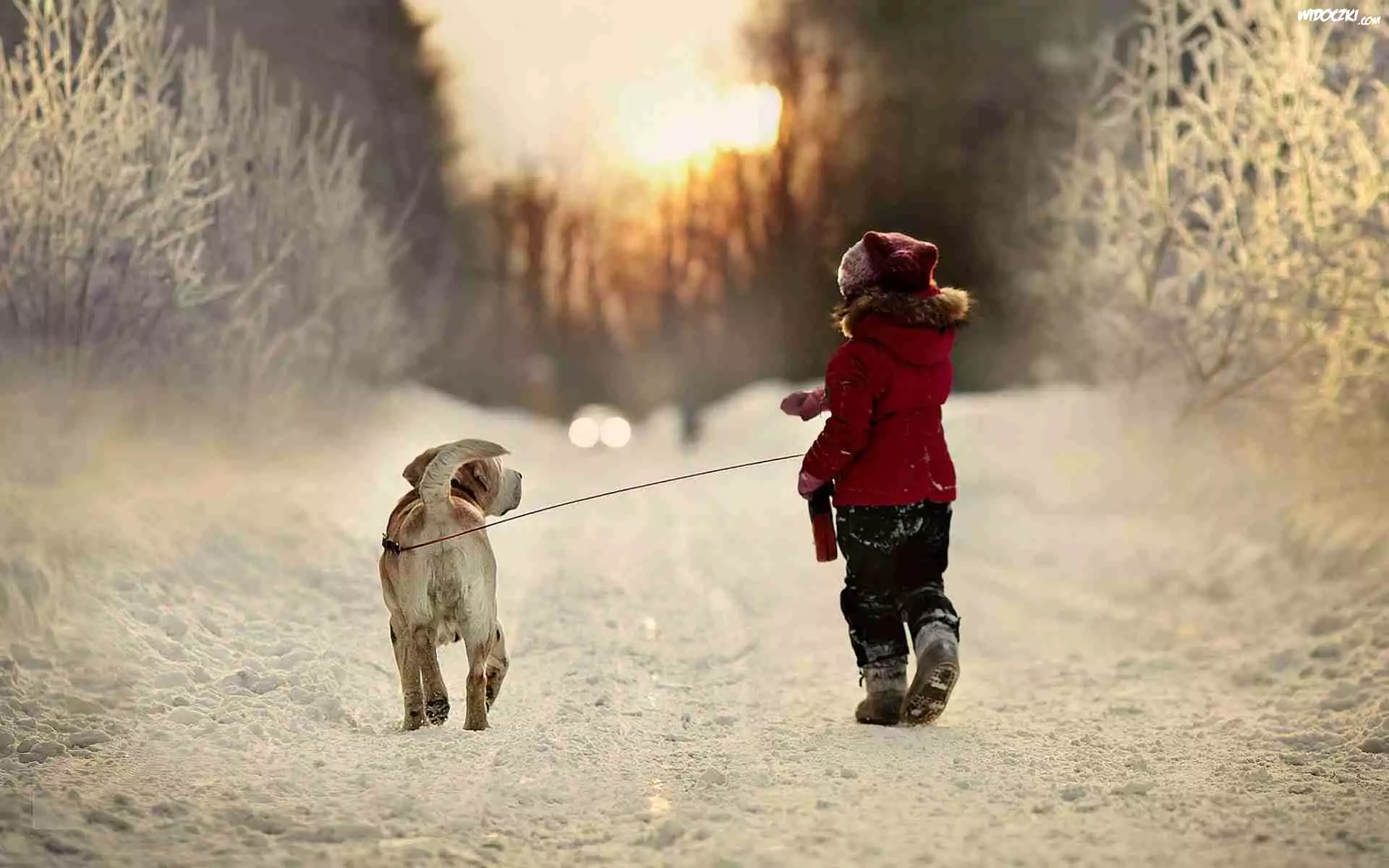 Zdjęcia, Dziewczynka, Z, Psem, Spacer, Droga, Las, Zima