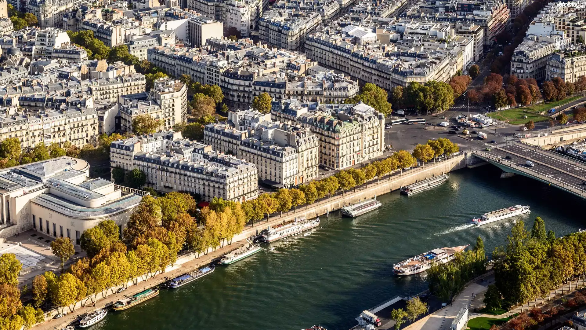 Zdjęcia, Z lotu ptaka, Domy, Rzeka Sekwana, Łodzie, Paryż, Francja