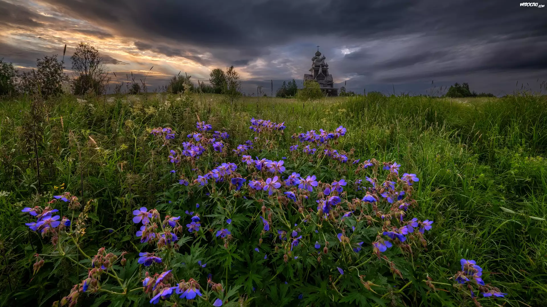 Zdjęcia, Łąka, Kwiaty, Cerkiew, Zachmurzone, Niebo, Drzewa