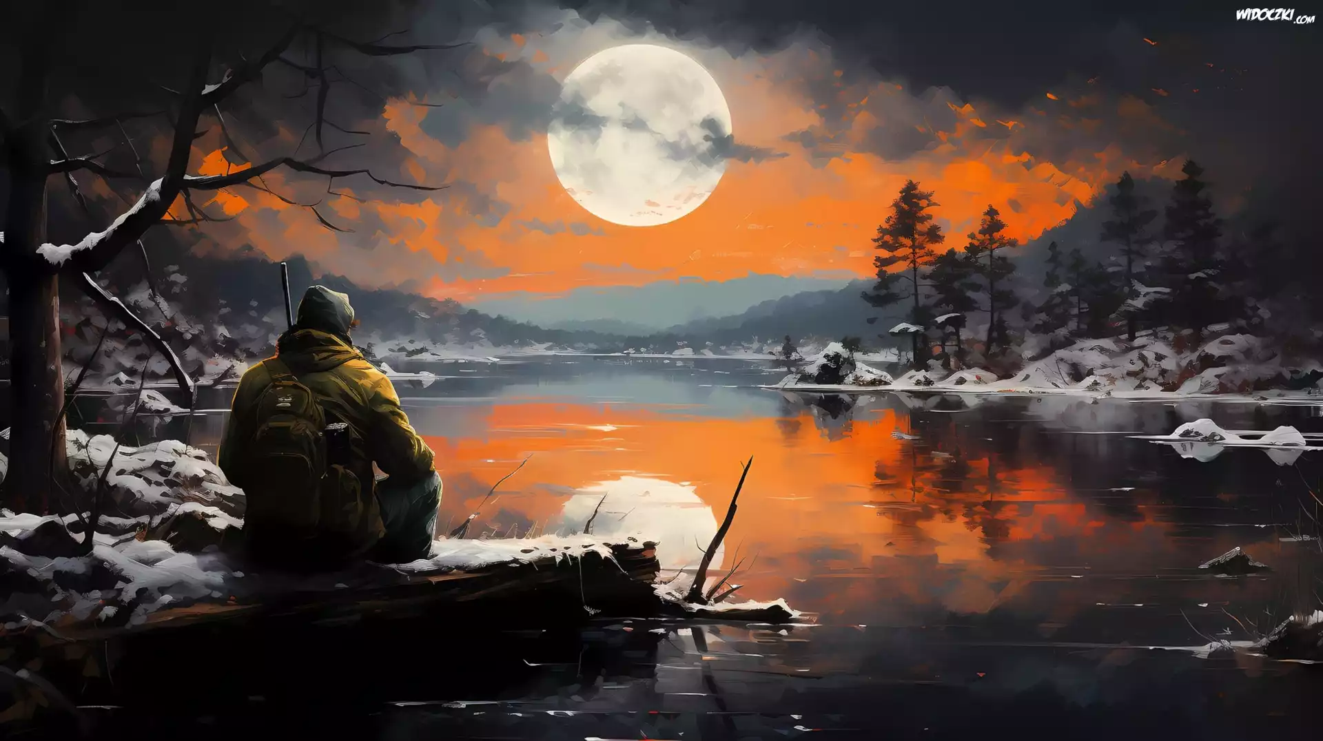 Zima, Jezioro, Mężczyzna, Zachód słońca, 2D
