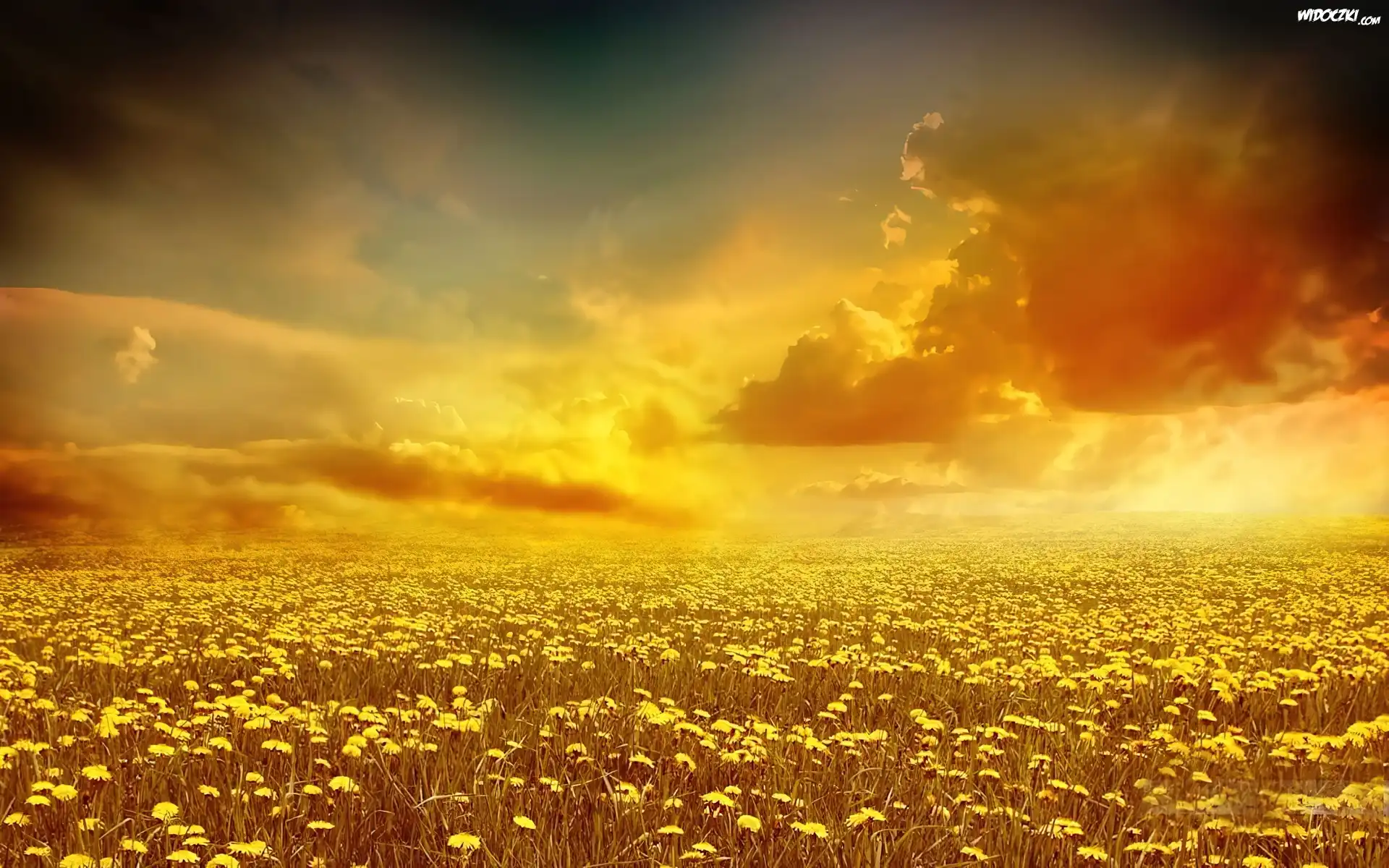 Zdjęcia, Zachód, Słońca, Chmury, Łąka, Kwiatki