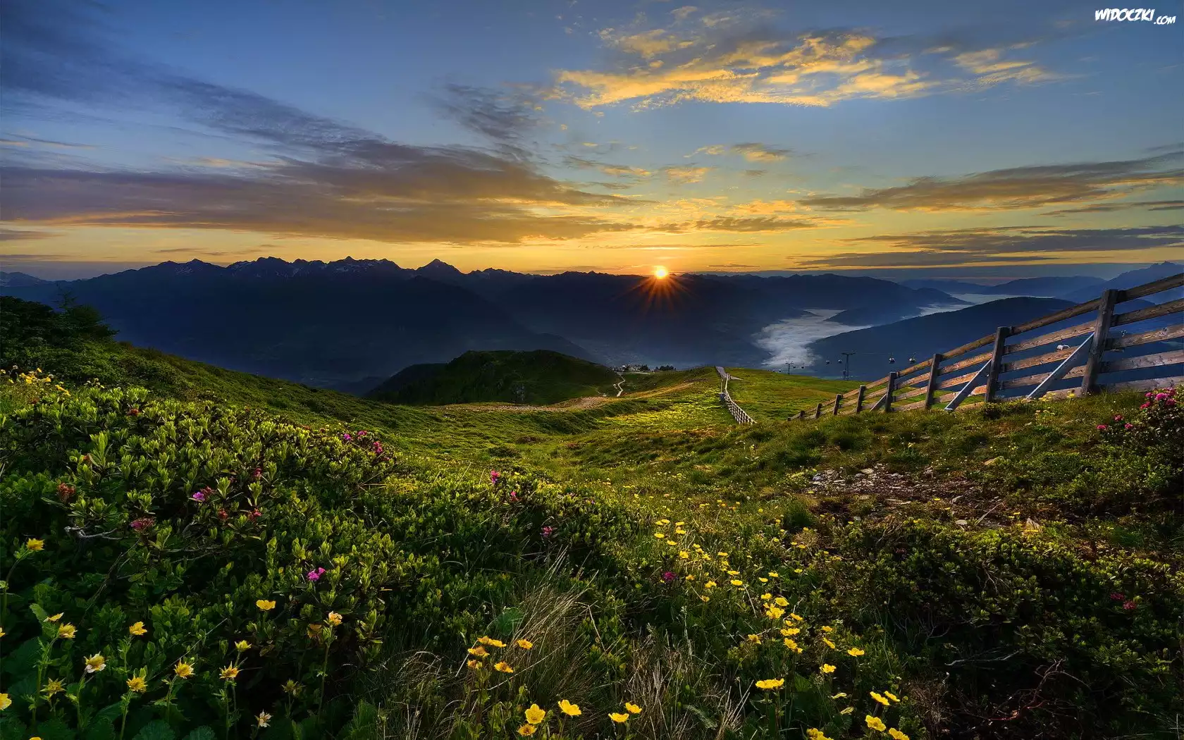 Zdjęcia, Zachód, Słońca, Góry, Łąka, Płot