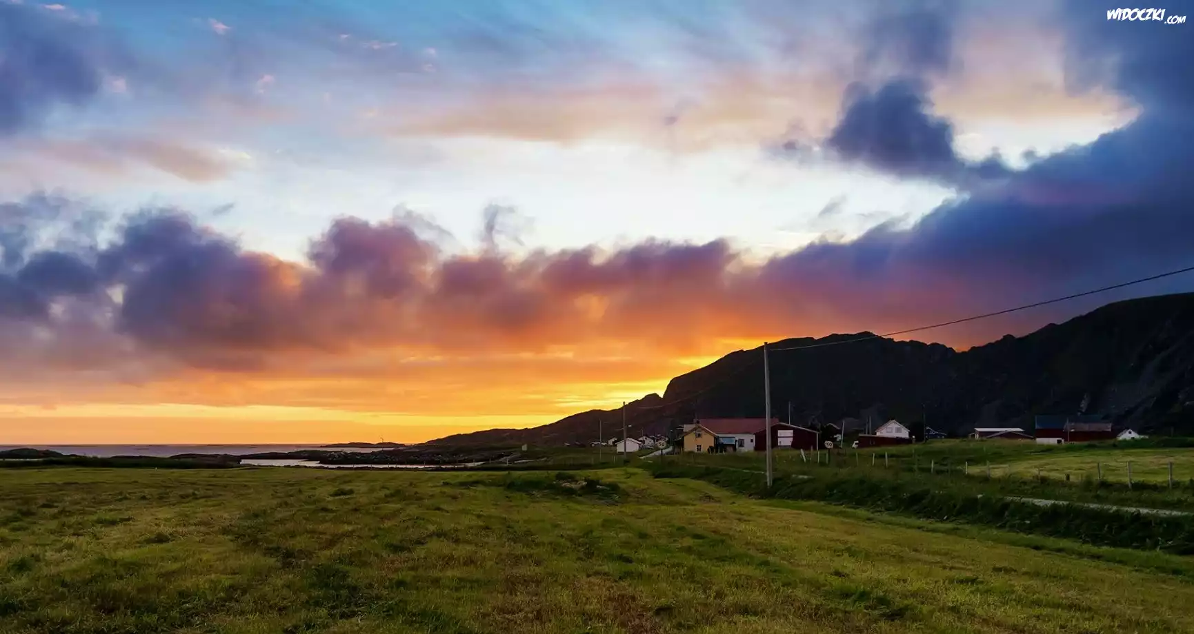 Zachód, Słońca, Góry, Łąka, Zabudowania