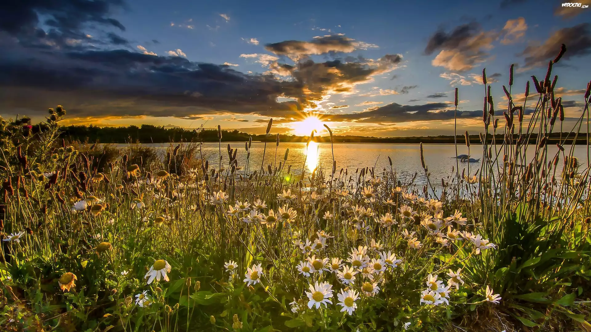 Zachód Słońca, Jezioro, Łąka, Kwiaty