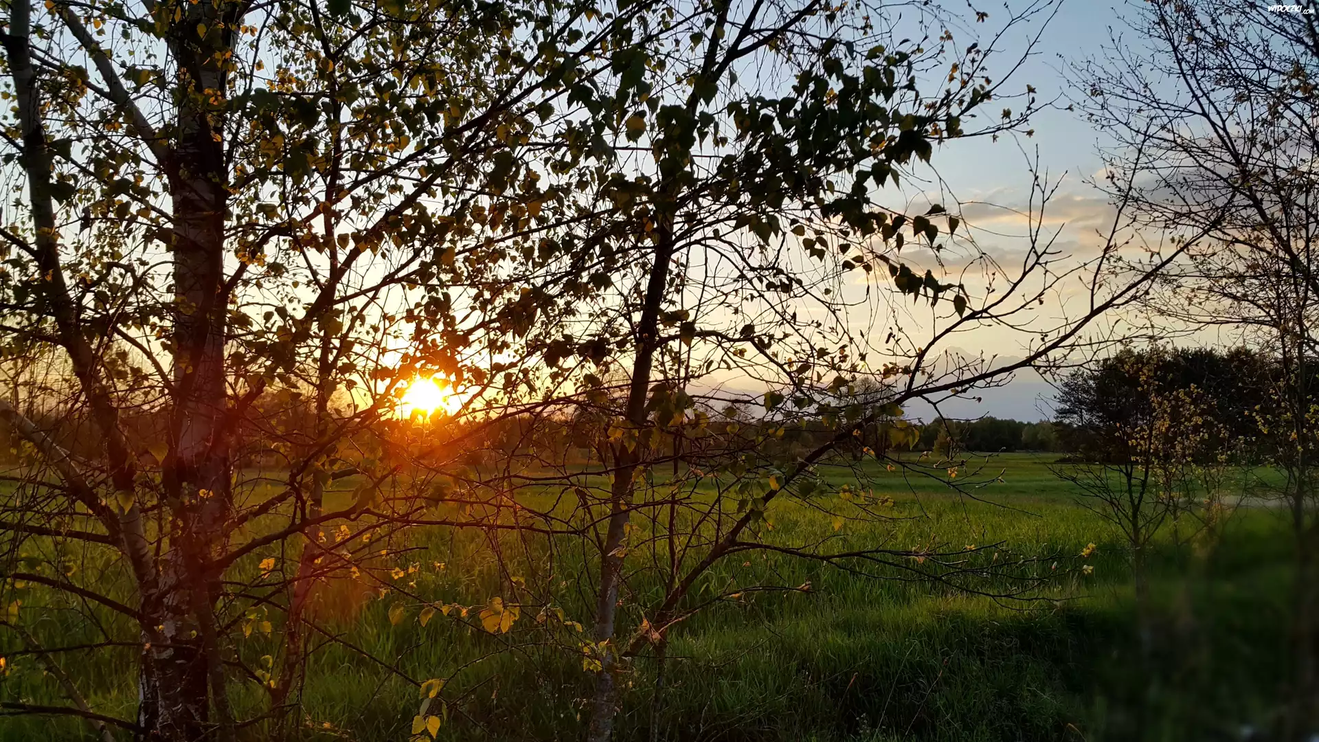Zdjęcia, Zachód, Słońca, Łąka, Brzoza