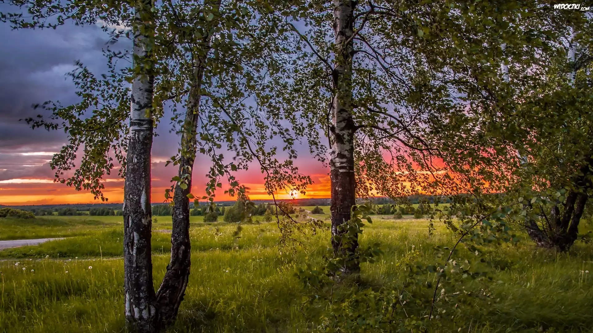 Zdjęcia, Zachód, Słońca, Łąka, Brzozy
