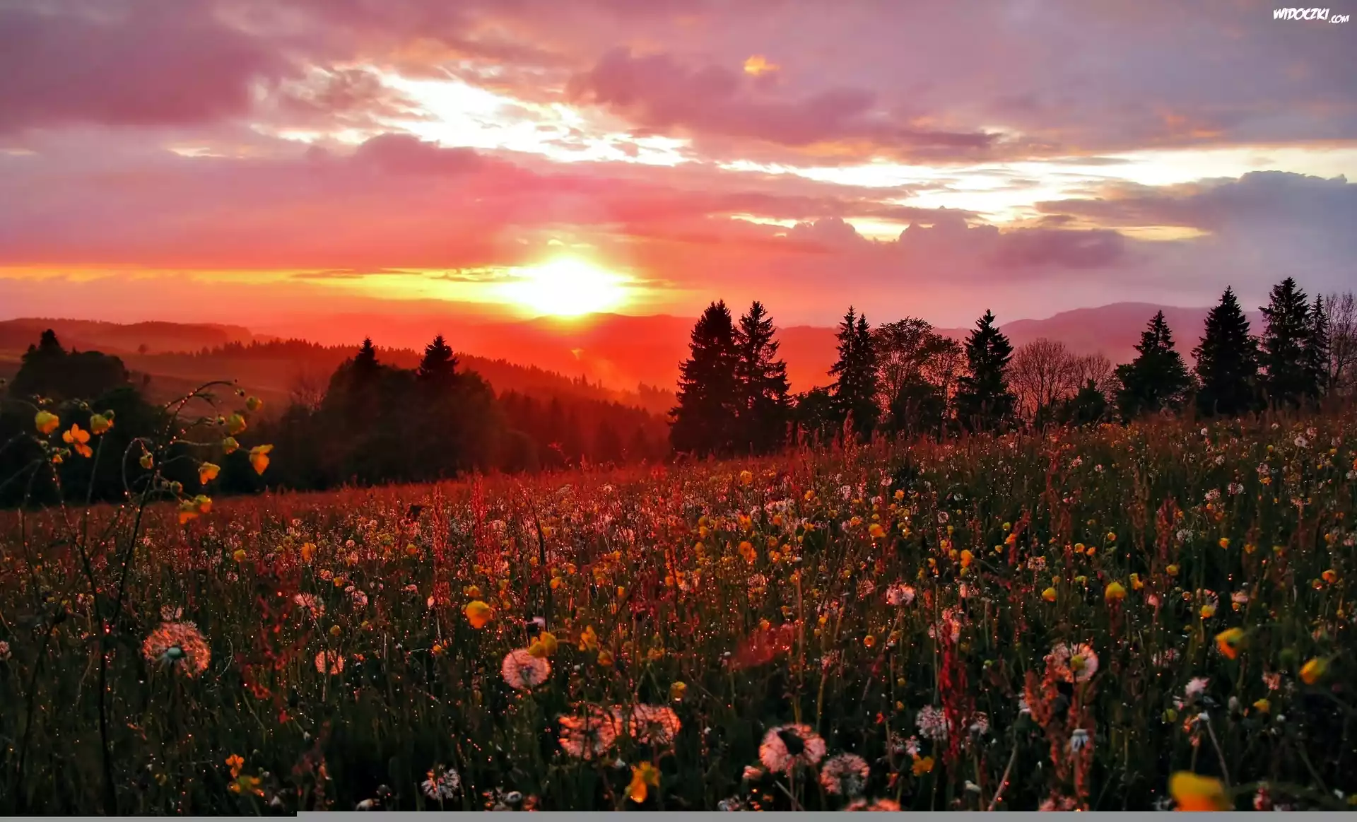 Zdjęcia, Zachód, Słońca, Łąka, Kwiaty