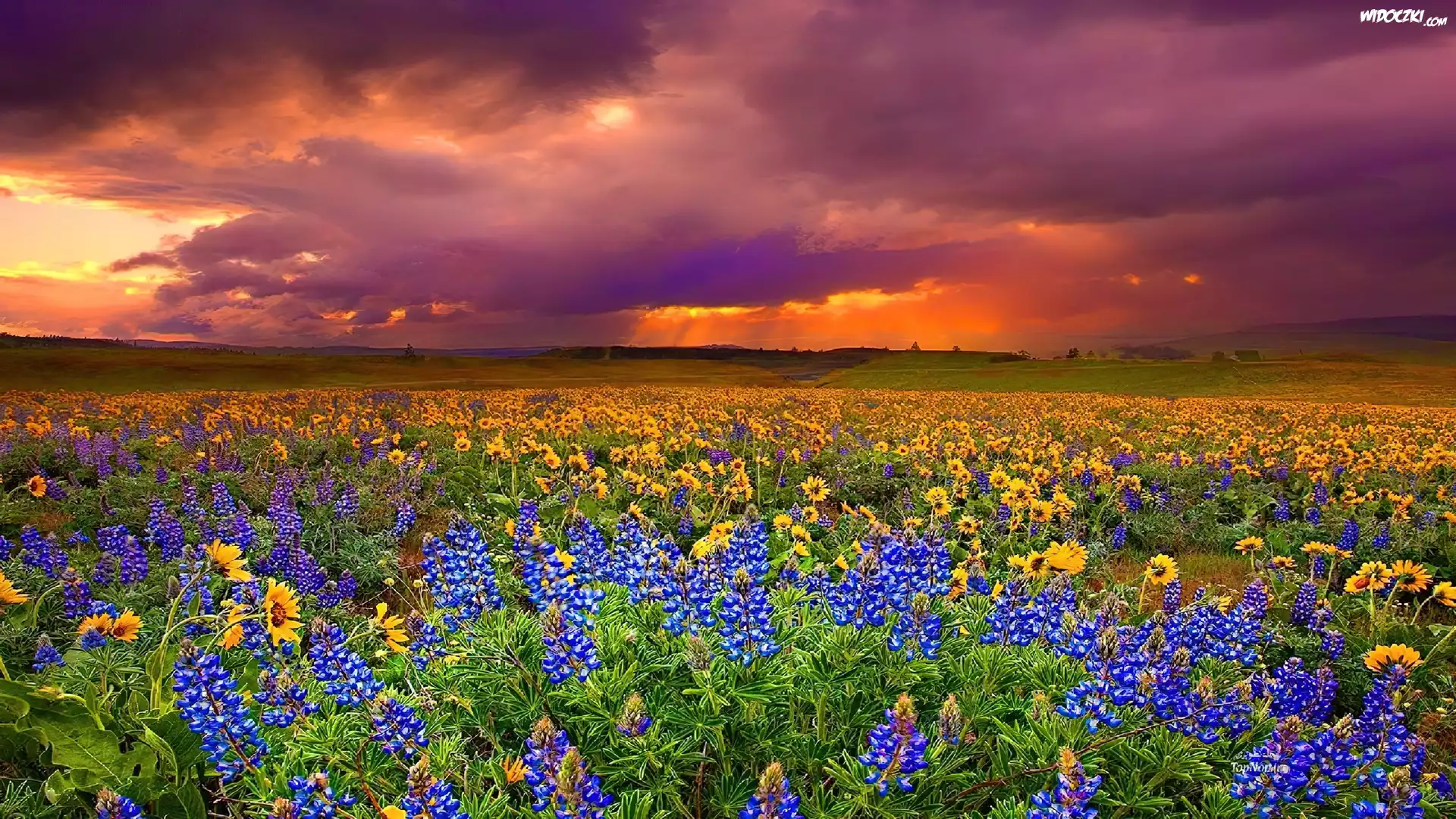 Zdjęcia, Zachód, Słońca, Łąka, Kwiaty