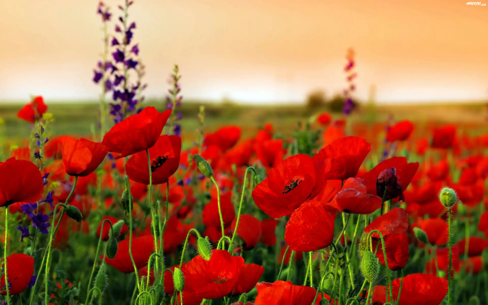Zdjęcia, Zachód, Słońca, Łąka, Maki