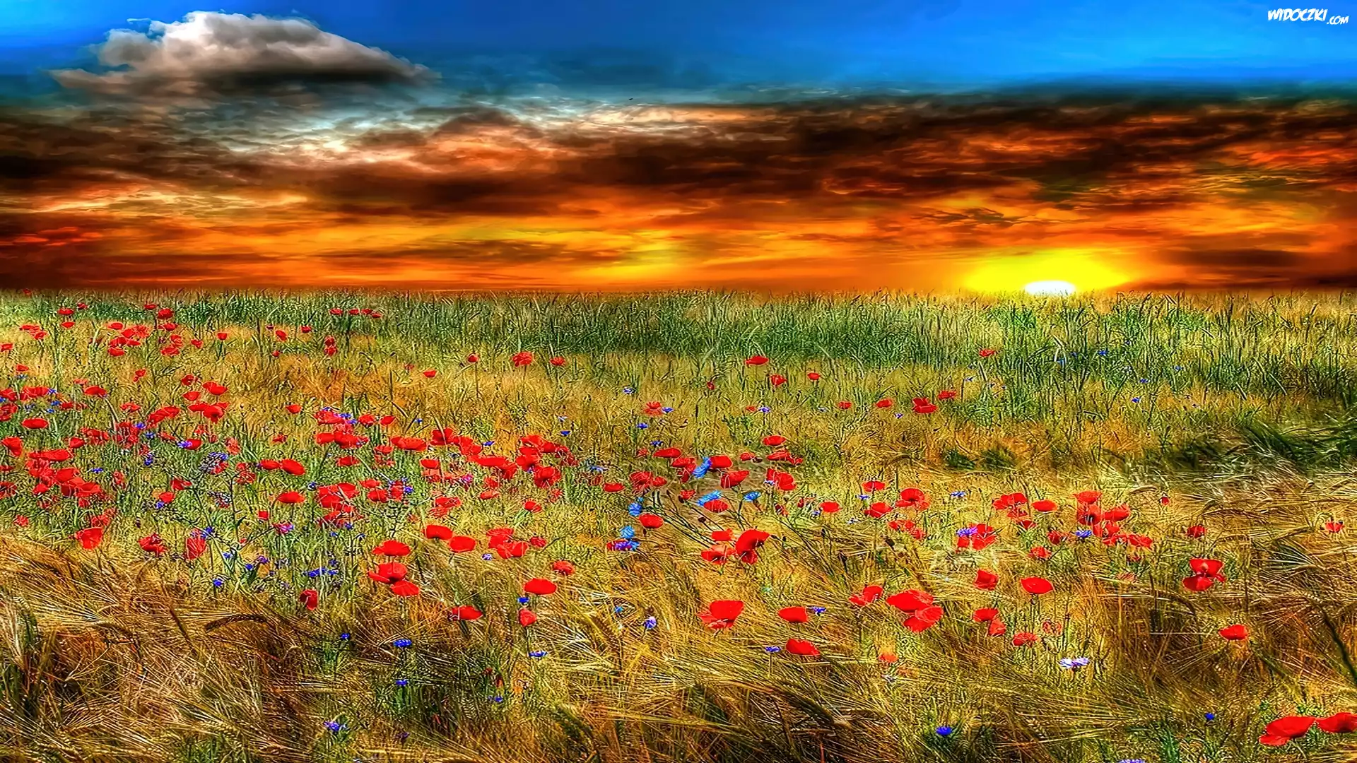 Zdjęcia, Zachód, Słońca, Łąka, Maki