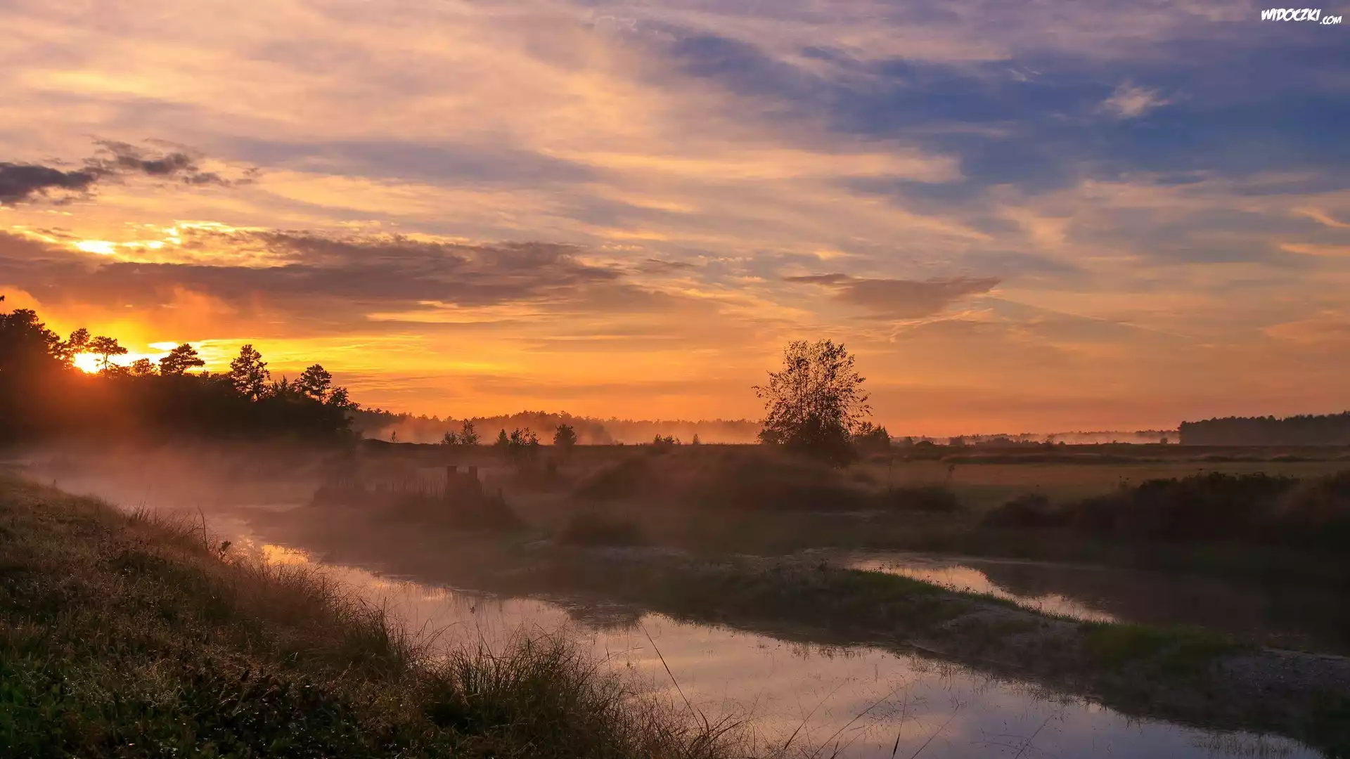 Zielona, Łąka, Wąska, Rzeczka, Drzewa Wyspa, Zachód Słońca Drzewa, Skały, Wodospad, Jeziorko Zachód Słońca, Skała, Morze Góry, Lasy, Rzeka Łąka, Fioletowe, Kwiaty, Ciemne, Chmury Zachód Słońca, Chmura Zachód Słońca Leśna, Rzeka, Zima Góra, Rzeki łąka Góra, łąki, Niebo Delfiny, Zachód słońca, Morze Magiczna, Mgła, Planety, Łąka