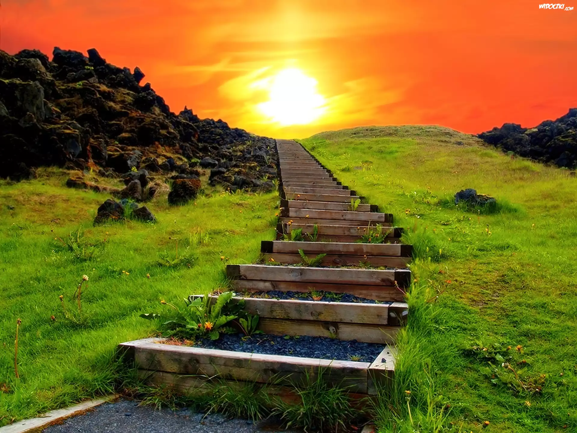 Zdjęcia, Zachód, Słońca, Łąka, Schody