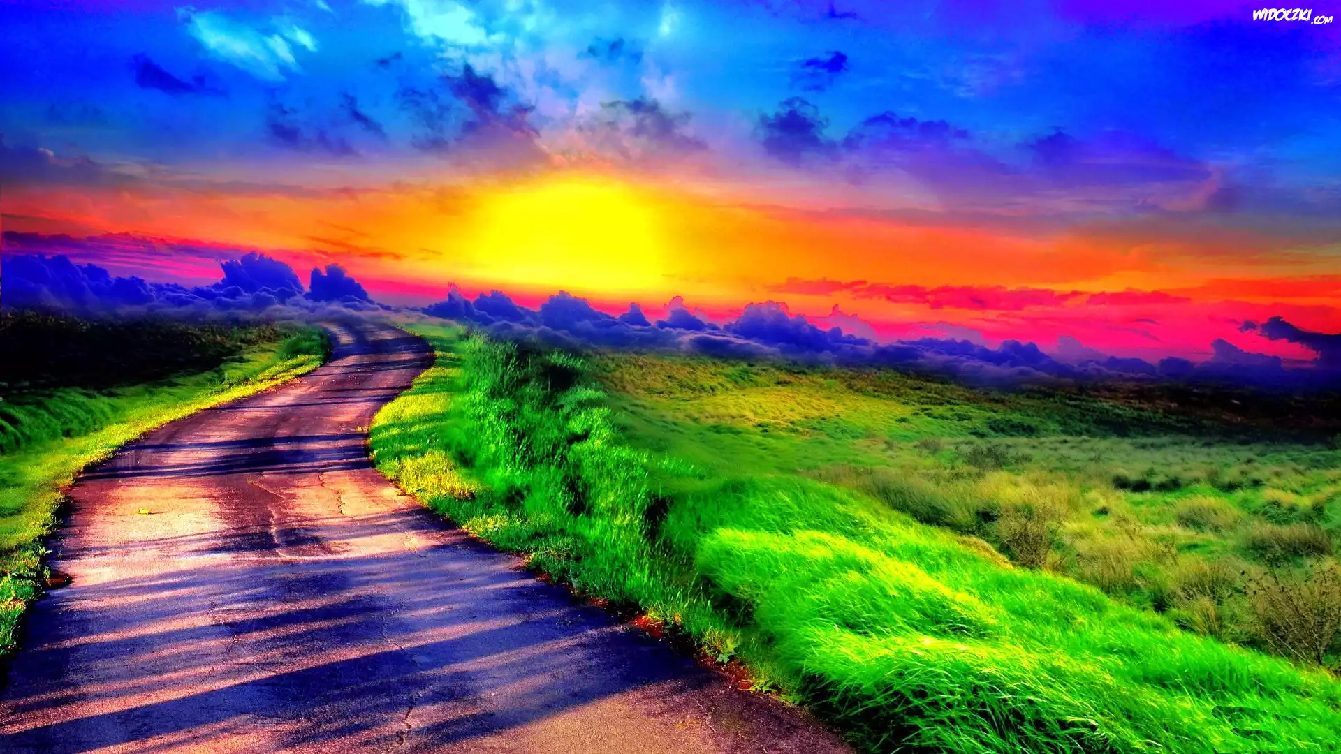 Zdjęcia, Zachód, Słońca, Łąki, Droga