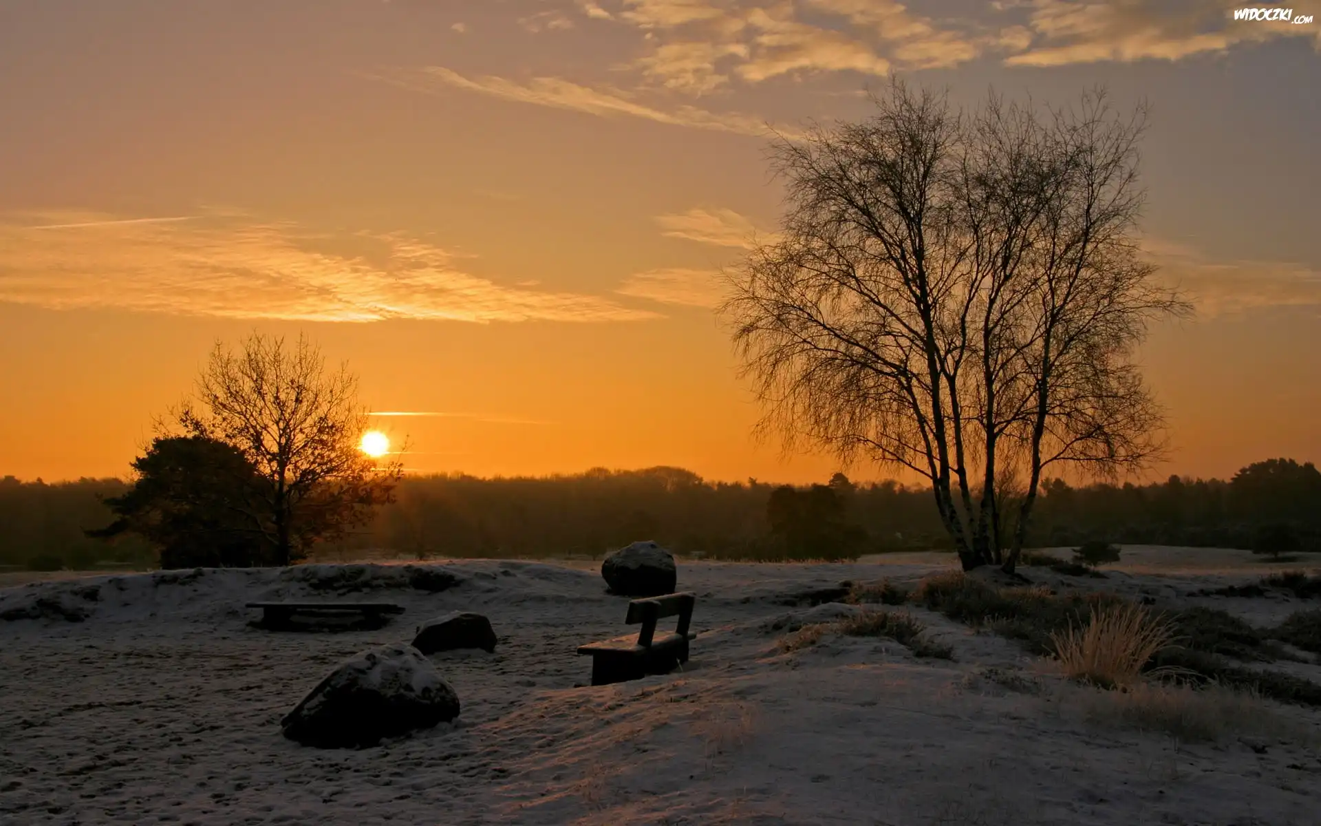 Zdjęcia, Zachód, Słońca, Drzewa, Krzewy, Ławeczka, Śnieg