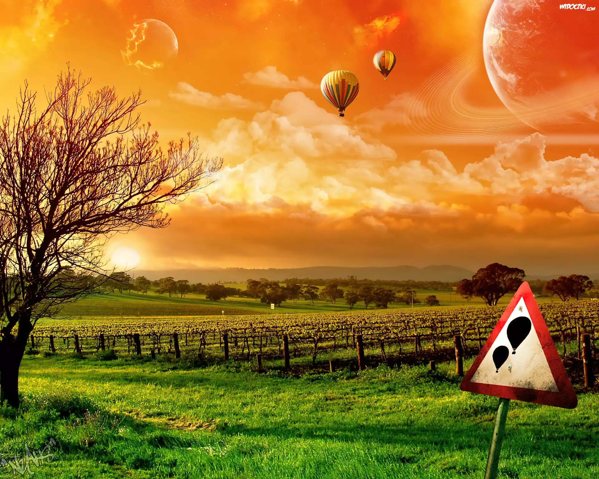 Zdjęcia, Zachód, Słońca, Pola, Balon, Znak