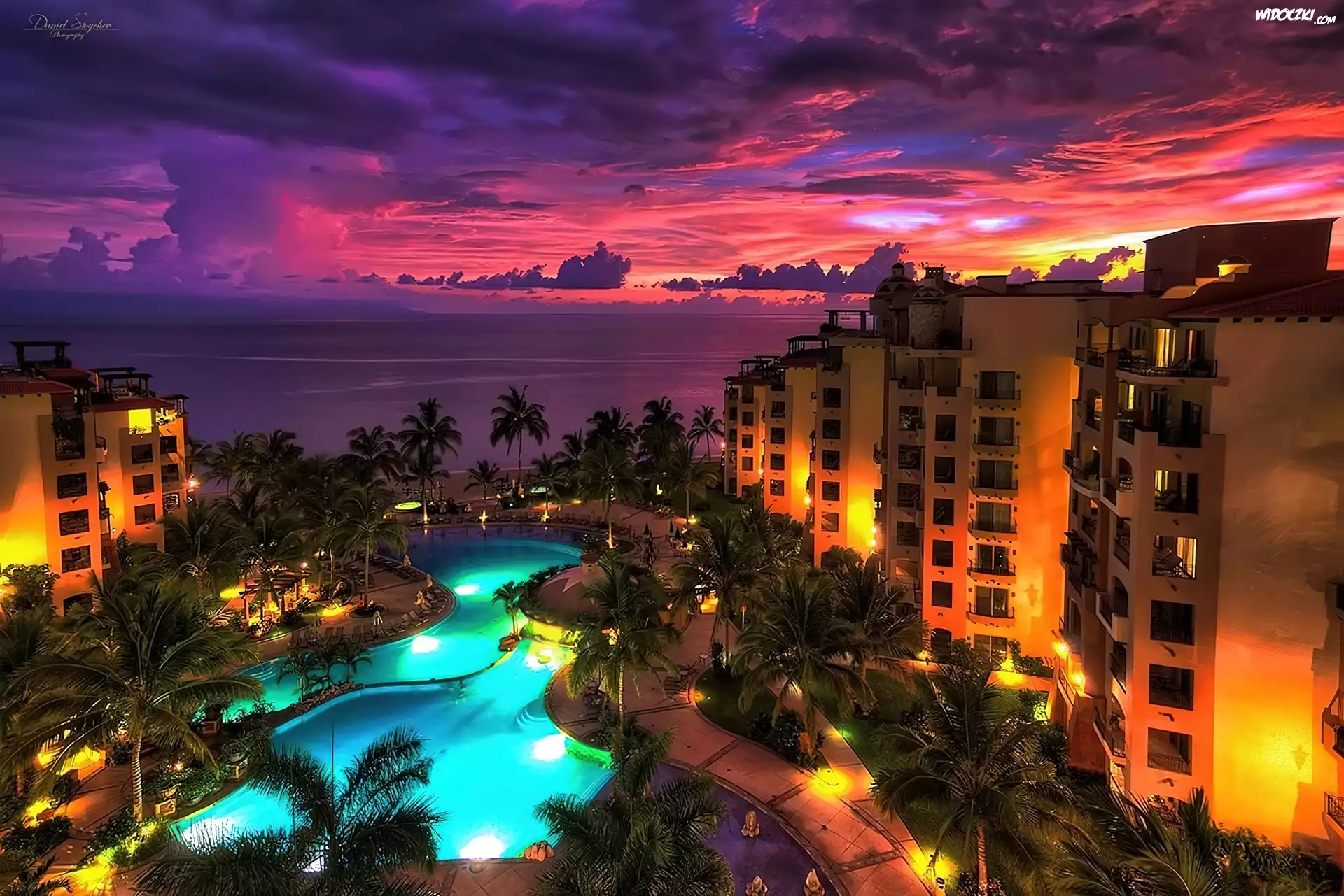 Zdjęcia, Zachód, Słońca, Osiedle, Basen, Palmy