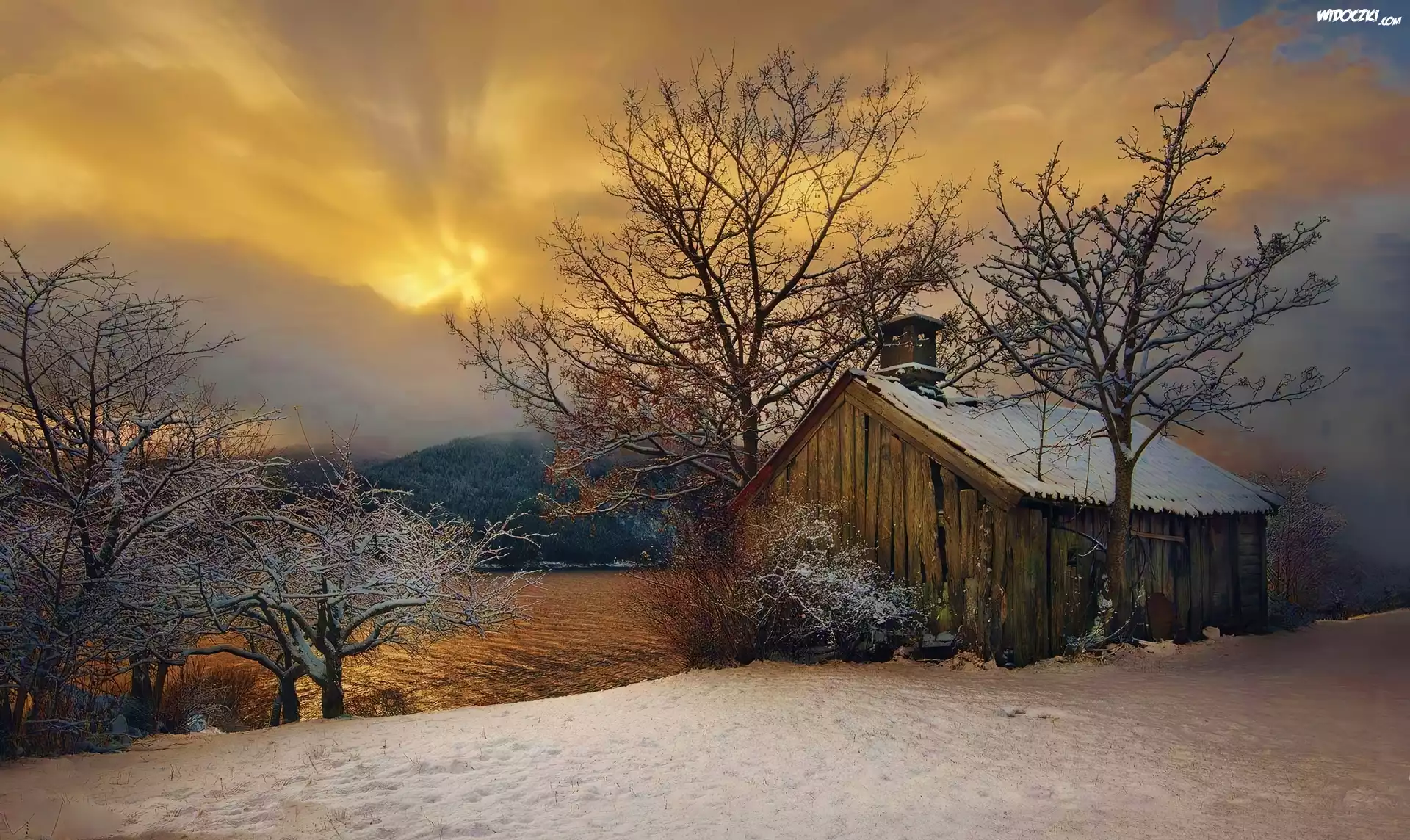 Zdjęcia, Zachód, Słońca, Jezioro, Stara, Chata, Drzewa