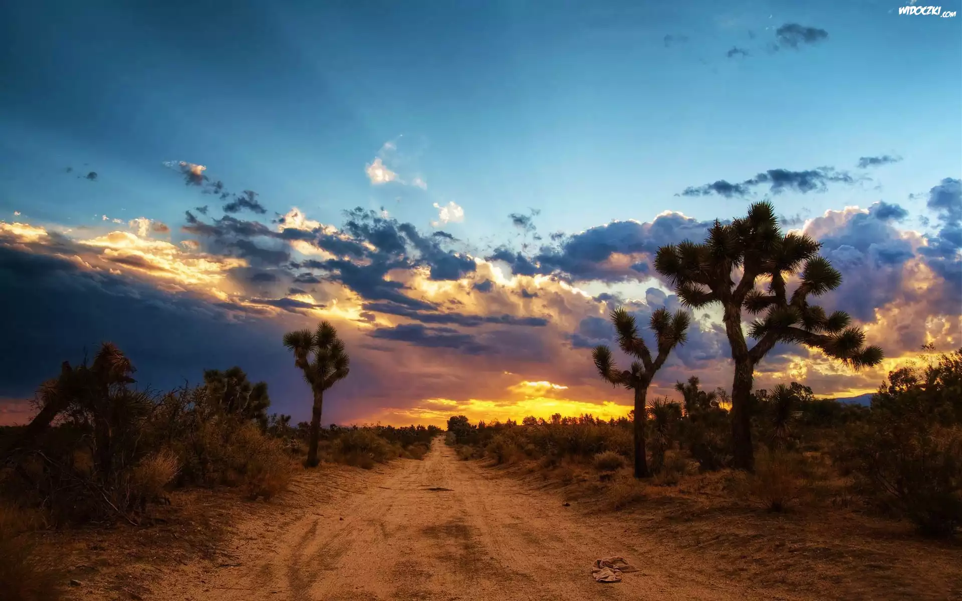 Zdjęcia, Zachód Słońca, Droga, Chmury, Kaktusy