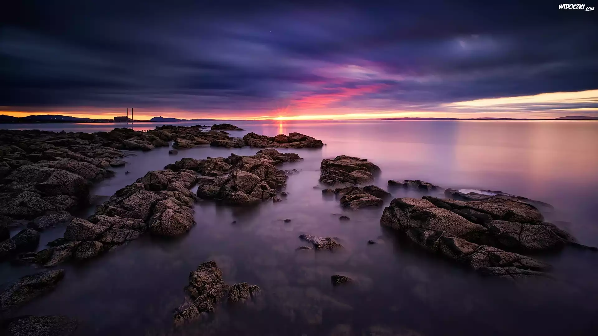 Zdjęcia, Zachód, Słońca, Granatowe, Chmury, Skały